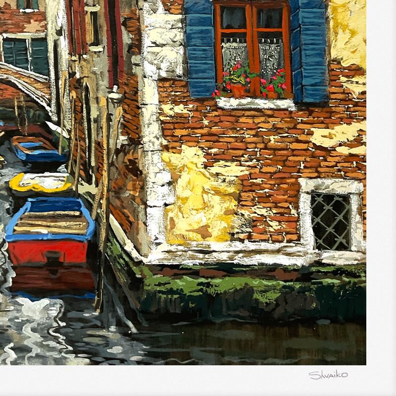 "Boats of Venice (White)" is a limited edition printer's proof on paper by Viktor Shvaiko, numbered 1/3 and hand signed by the artist. Includes Letter of Authenticity. Measures approx. 27" x 34" (border), 22.5" x 30" (image).