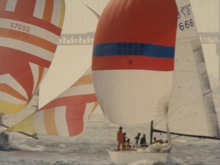 In this photo, a colorful array of boats break through the fog in San Francisco Bay, with the hazy Golden Gate Bridge in the background.Artist: Signed in ink, lower right on the matteMedium: PhotographFraming: Double matted in blue gray and red, in red painted metal frameFrame size: 16 1/4 x 20 1/4 inchesCondition: Excellent