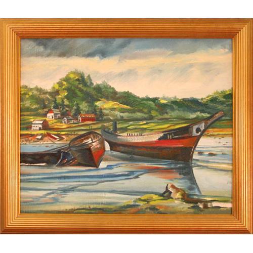 ?Boats on Shore? is a quintessential example of Robert MacIsaac?s contribution to the world of art. The maritime genre, of which he was so fond, is showcased in breathtaking refinement and control in what is arguably his most mature style of painting. Two boats sit ashore as the delicately rendered water laps gently at their ...