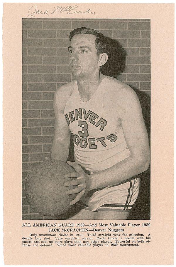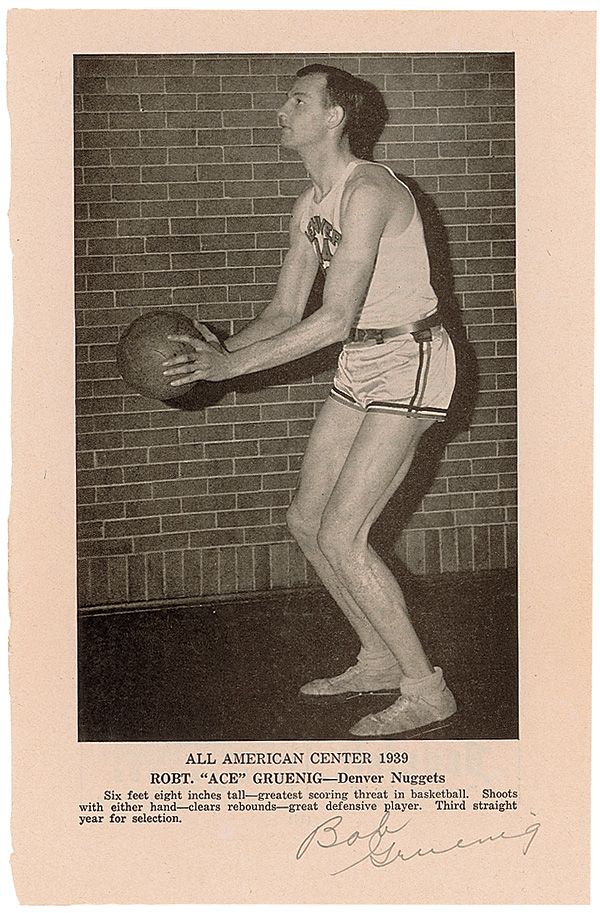 Basketball Hall of Famers. Two vintage program pages, both 6 x 9, of Gruenig and McCracken in their Denver Nuggets uniforms, signed in pencil by Gruenig and McCracken respectively. In fine condition, with some scattered light creases. McCracken and Gruenig were both posthumously inducted into the Hall of Fame rendering the availability of their signatures on the marketplace practically nonexistent and with a photographic format such as these being of an even further rarity.