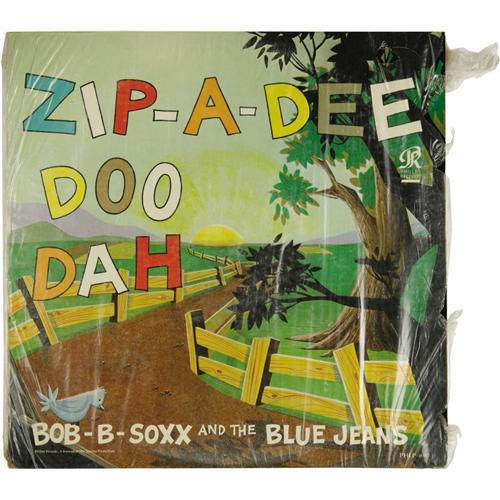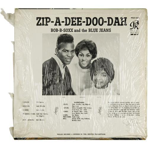<B>Bob-B-Soxx and the Blue Jeans "Zip-A-Dee-Doo-Dah" LP Philles 4002 (1962).</B></I> A Phil Spector production, this was a breath of fresh air in 1962, with the brilliant, updated version of the title cut. Spector spared no expense, employing musicians like Al De Lory, Glen Campbell, Hal Blaine, Leon Russell, and Billy Strange, among others, to back his young trio, which included Darlene Love. The cover is one of Pop music's all-time greats! The loose plastic shrinkwrap has been opened but still protects nearly all of the near perfect cover. Condition: NM 8/ NM 8.