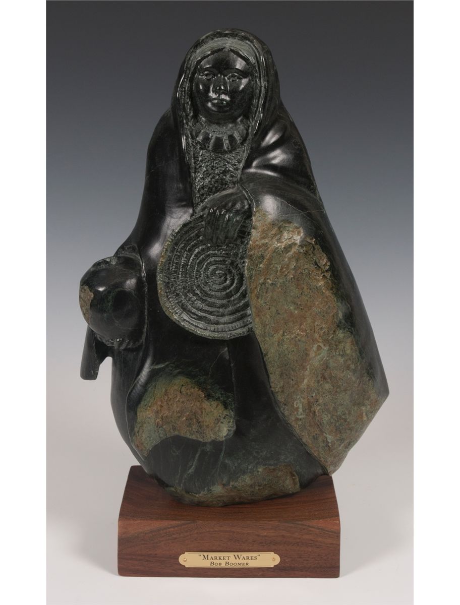 Bob Boomer (1944 - ). Market Wares. 14" x 9.5" x 5" stone carving. Inscribed: BOB BOOMER © 10. Provenance: Estate of Ken Holm, Denver, CO.