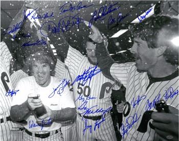 The 1980 Philadelphia Phillies finished with a regular-season record of 91 wins and 71 losses, which was good enough to regain the National League East title by just one game over the Montreal Expos. The Phillies went on to defeat the Houston Astros in the NLCS to gain their first NL title since 1950, then defeated the Kansas City Royals to win their first-ever World Series Championship, taking 98 seasons to do so. The Phillies were known as "The Cardiac Kids" due to close games that were almost blown. This 1983 B&W Celebration 16x20 Photo was signed by the 1980 World Series Champion Philadelphia Phillies 16x20 Photo including: Luis Aguayo, Ruben Amaro, Ramon Aviles, Bob Boone, Warren Brisstar, Marty Bystrom, Larry Christenson, Greg Gross, Dan Larsen, Greg Luzinski, Bake McBridge, Keith Moreland, Tim McCarver, Dickie Noles, Al Oliver, Ron Reed, Kevin Saucier, Manny Trillo, Del Unser, Ozzie Virgil and George Vukovich. Leaf Authentics Hologram and Certificate of Authenticity from Athlon Sports.