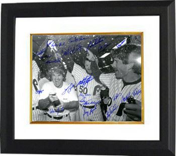 The 1980 Philadelphia Phillies finished with a regular-season record of 91 wins and 71 losses, which was good enough to regain the National League East title by just one game over the Montreal Expos. The Phillies went on to defeat the Houston Astros in the NLCS to gain their first NL title since 1950, then defeated the Kansas City Royals to win their first-ever World Series Championship, taking 98 seasons to do so. The Phillies were known as "The Cardiac Kids" due to close games that were almost blown. This 1983 B&W Celebration 16x20 Photo was signed by the 1980 World Series Champion Philadelphia Phillies 16x20 Photo including: Luis Aguayo, Ruben Amaro, Ramon Aviles, Bob Boone, Warren Brisstar, Marty Bystrom, Larry Christenson, Greg Gross, Dan Larsen, Greg Luzinski, Bake McBridge, Keith Moreland, Tim McCarver, Dickie Noles, Al Oliver, Ron Reed, Kevin Saucier, Manny Trillo, Del Unser, Ozzie Virgil and George Vukovich. Leaf Authentics Hologram and Certificate of Authenticity from Athlon Sports. Custom White Mat and Premium Black Frame as shown.