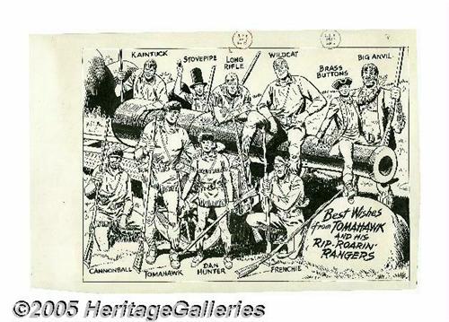 <B>Bob Brown - Tomahawk Unpublished Pin-Up Illustration Original Art (DC, circa 1967).</B></I> Long-time Tomahawk artist Bob Brown drew this panoramic group portrait of Tomahawk and his Rangers posing with their big gun. The splash was written off and never used, most likely because the <B>Tomahawk</B></I> title changed directions in 1968 when Robert Kanigher came on board as the head writer. The image area of the art is 14.25" x 10.25", and the art is in Excellent condition.