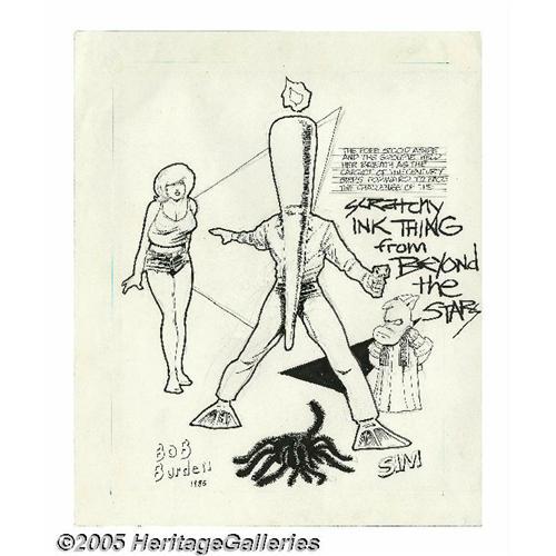 <B>Bob Burden and Dave Sim - Flaming Carrot and Cerebus Sketch Original Art (1985).</B></I> The Flaming Carrot debuted with a short story in "<B>Visions</B></I>, a limited-run comic anthology, and later moved to his own title, " "<B>Flaming Carrot Comics</B></I> which was published by Dave Sim's company, Aardvark-Vanaheim in 1984. Here, Burden teams up with " "<B>Cerebus</B></I> creator Dave Sim, to produce this sketch, titled ""Scratchy Ink Thing from Beyond the Star."" Drawn in pencil and ink on a sheet of 14"" x 17"" illustration paper, this remarkable sketch features both of these creators' most famous characters. In Excellent condition. <BR><BR><B>Important notice:</B> Heritage usually auctions material at the rate of 200-250 lots per hour. On some occasions eBay Live bid software or the Internet may not be able to keep up with the pace of the auction. We recommend placing a realistic absentee bid now as insurance to avoid disappointment. Occasionally the auctioneer may eliminate or reject an eBay Live bid, and the auctioneer may also reopen a lot after the close of the eBay live bidding (usually because we missed an audience bid), and may reject your bid even if it shows you as the winning bidder. By bidding via eBay Live, you agree that Heritage may award the lot to another bidder at its sole discretion under the circumstances described above or any other reasonable circumstances. Since eBay bids are not shown to us until we open the lot on the floor, we treat those bids just like floor bids. In most cases the floor responds before the eBay bid is presented to us, due to Internet lag time, so for consistency we have made it a policy that floor bids are always considered first over tie eBay live bids. Also please note that all Heritage lots purchased through eBay Live carry a 20% Buyer's Premium. Please make sure you read the Terms and Conditions before you bid. This lot is being auctioned in conjunction with a live floor auction by Heritage Galleries & Auct