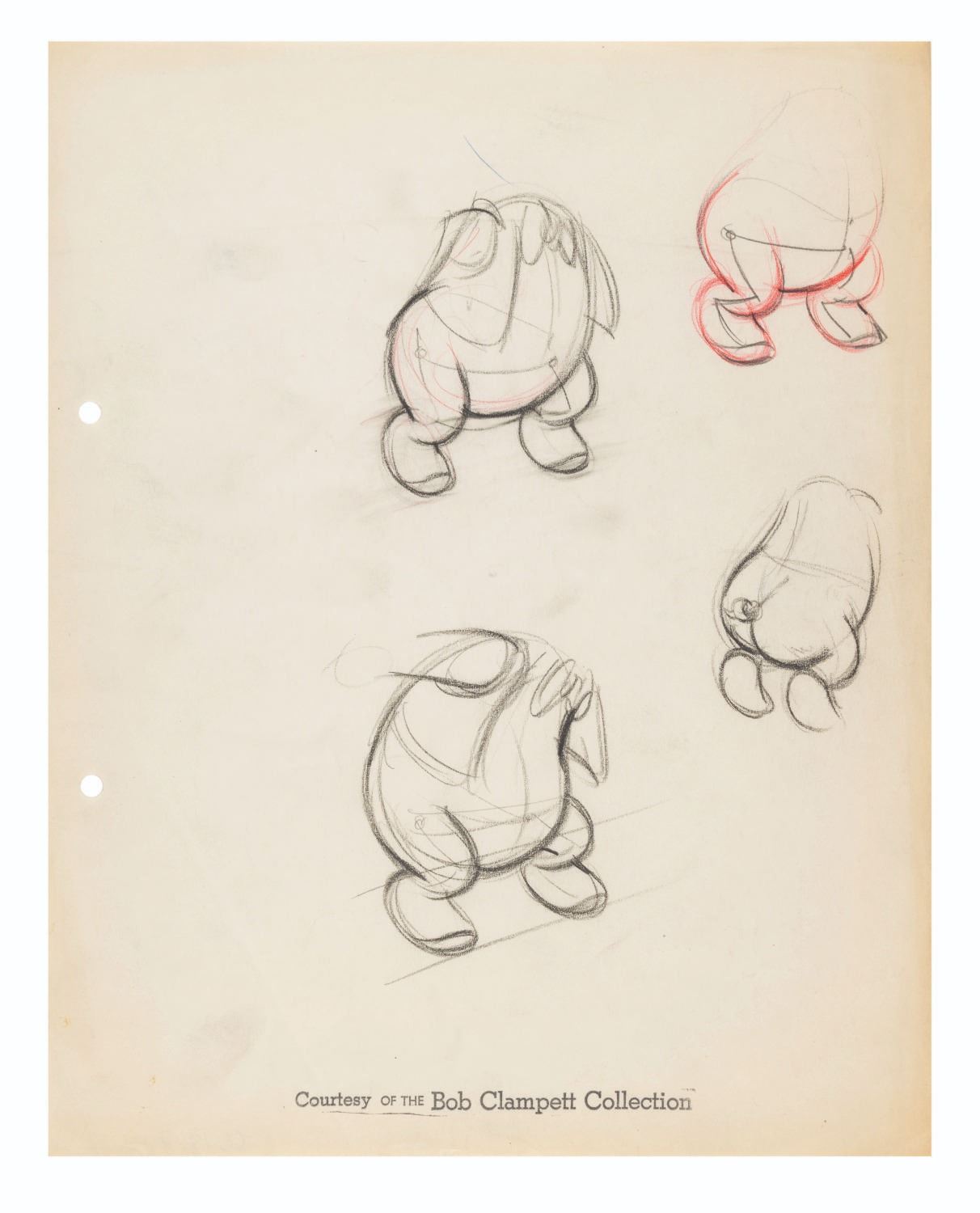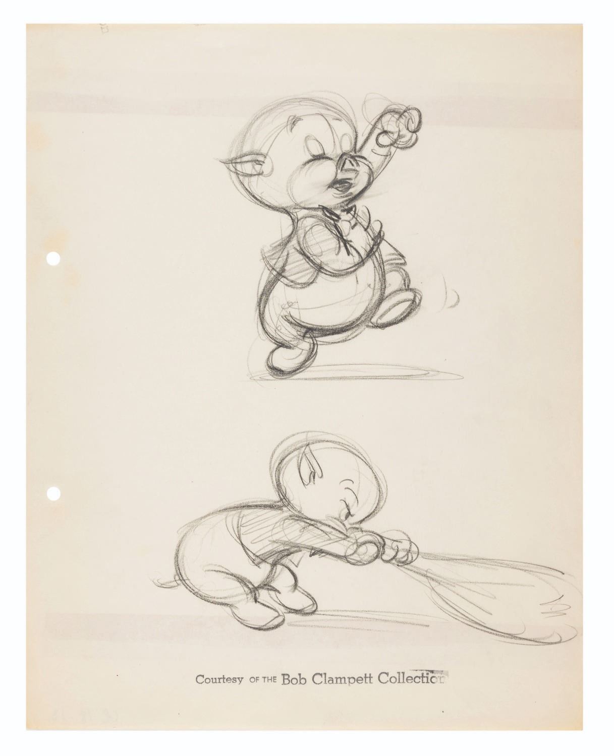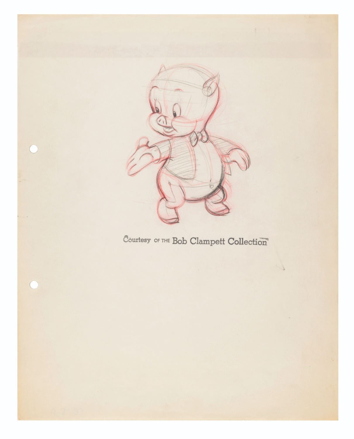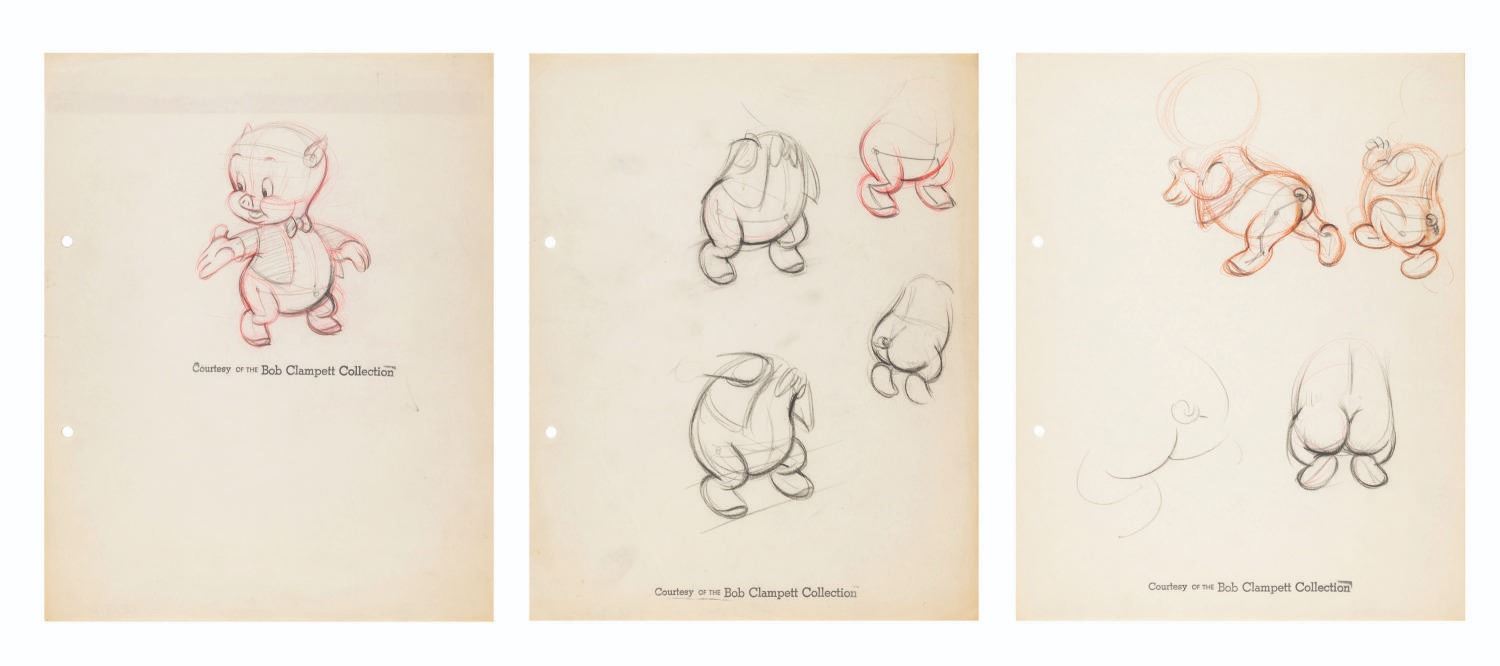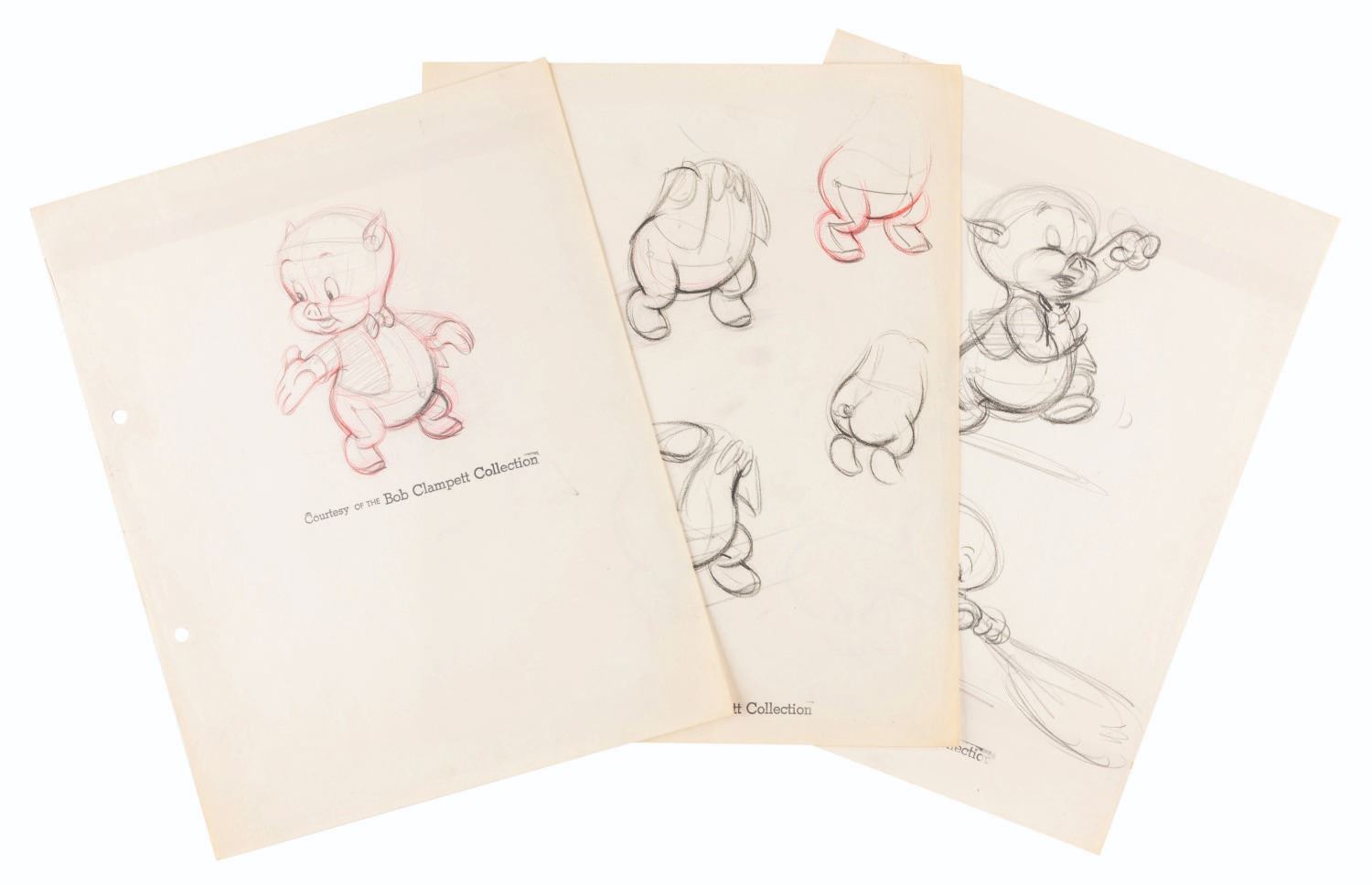 (Schlesinger, 1939) Three sheets of concept drawings for Bob Clampett’s redesign of Porky Pig, adjusting his age and giving the character consistency in appearance and personality. With image sizes from 1.75” x 2.75” to 3.5” x 5” on 9.5” x 12” animation paper, the graphite and colored pencil drawings are in good to very good condition with light creases, a corner fold, edge wear, tape on the reverse from production use, and discoloration from age. Each drawing is stamped with “Courtesy of the Bob Clampett Collection.”