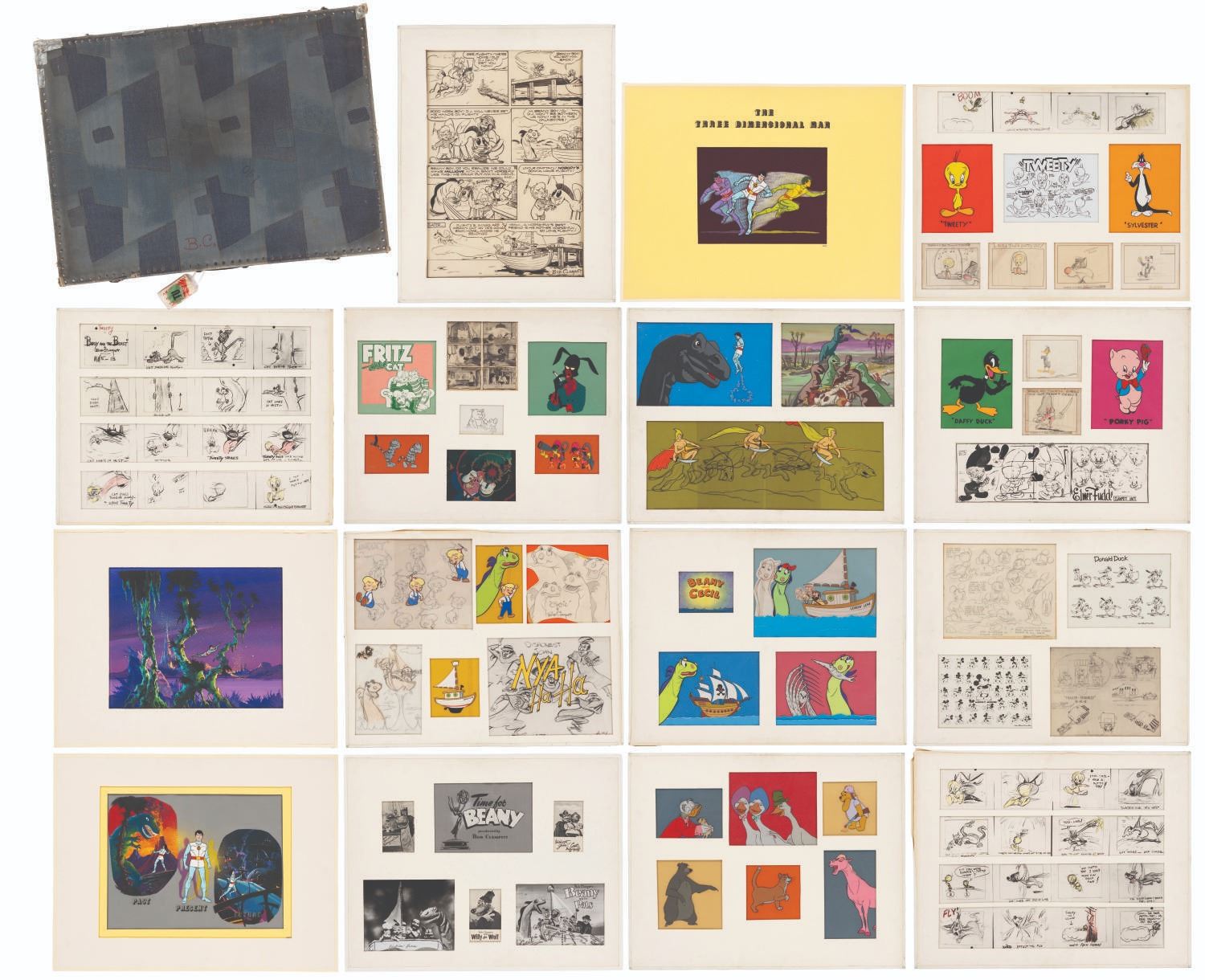 (Clampett, 1970s-80s) Bob Clampett’s personal selection of original art representing his career. Throughout the 1970s and 80s, Bob travelled to conventions, colleges, and screenings presenting a retrospective of his career in animation. This custom denim-patch-patterned oversized case travelled with him, and it still bears the original identification tag hand-written by Bob with his Hollywood Studio address. Inside is a 10-panel presentation of incredible original pieces from Clampett’s career. Highlights of these boards include: