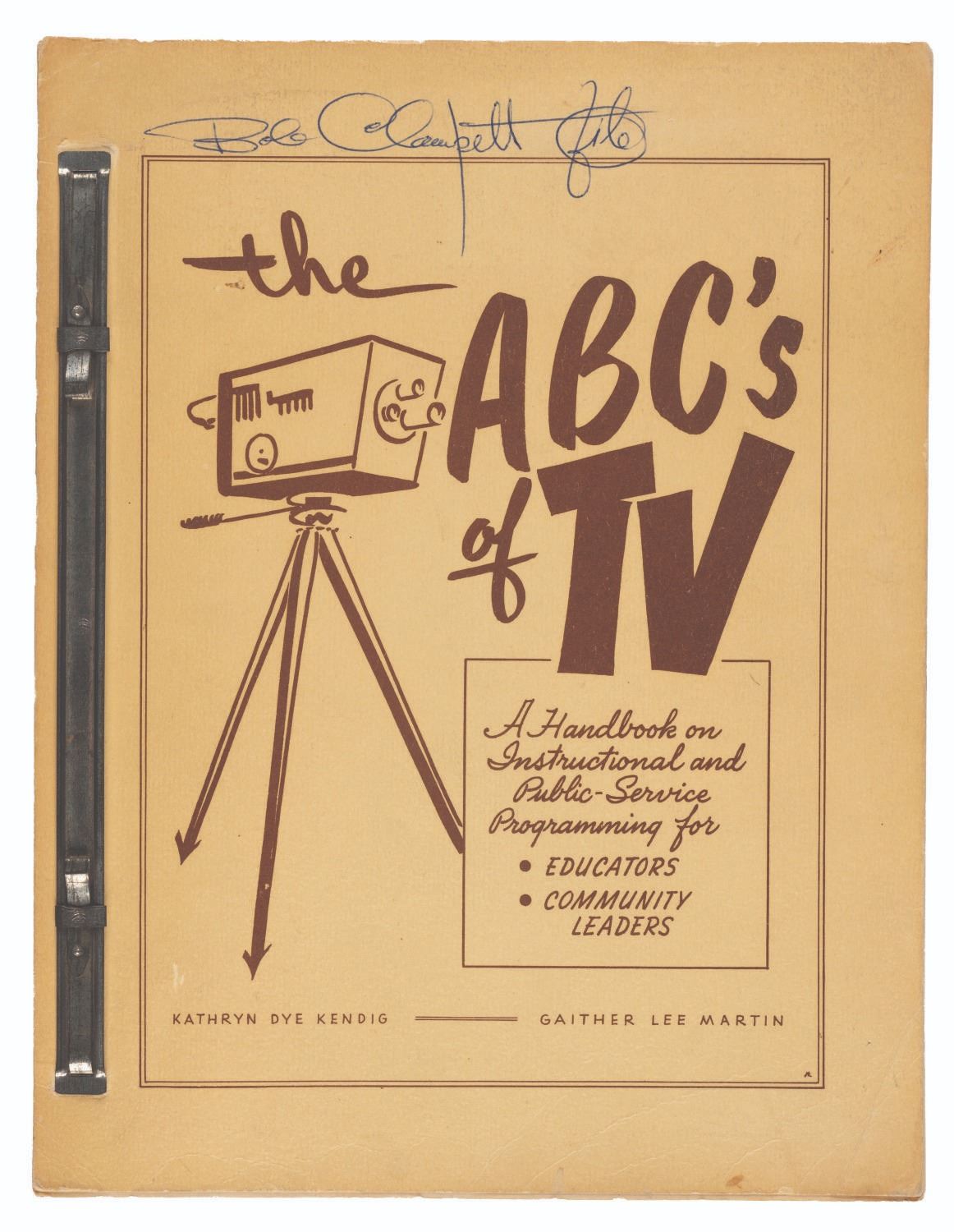 (Kendig/Martin, 1957) A copy of “The ABC’s of TV” given to Bob Clampett by the co-author, Kathryn Dye Kendig. The book is an instructional manual on how to produce instructional and public service programming for television and has been inscribed to Clampett by Kendig on the front page. Measuring 11” x 8.5” x 0.5” thick, the book is in very good condition with wear and light discoloration from age.