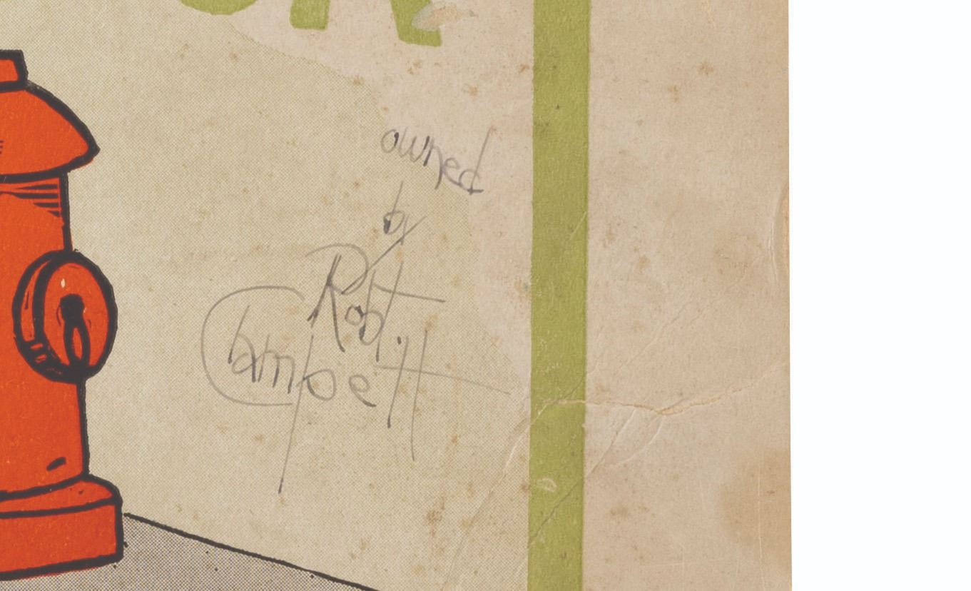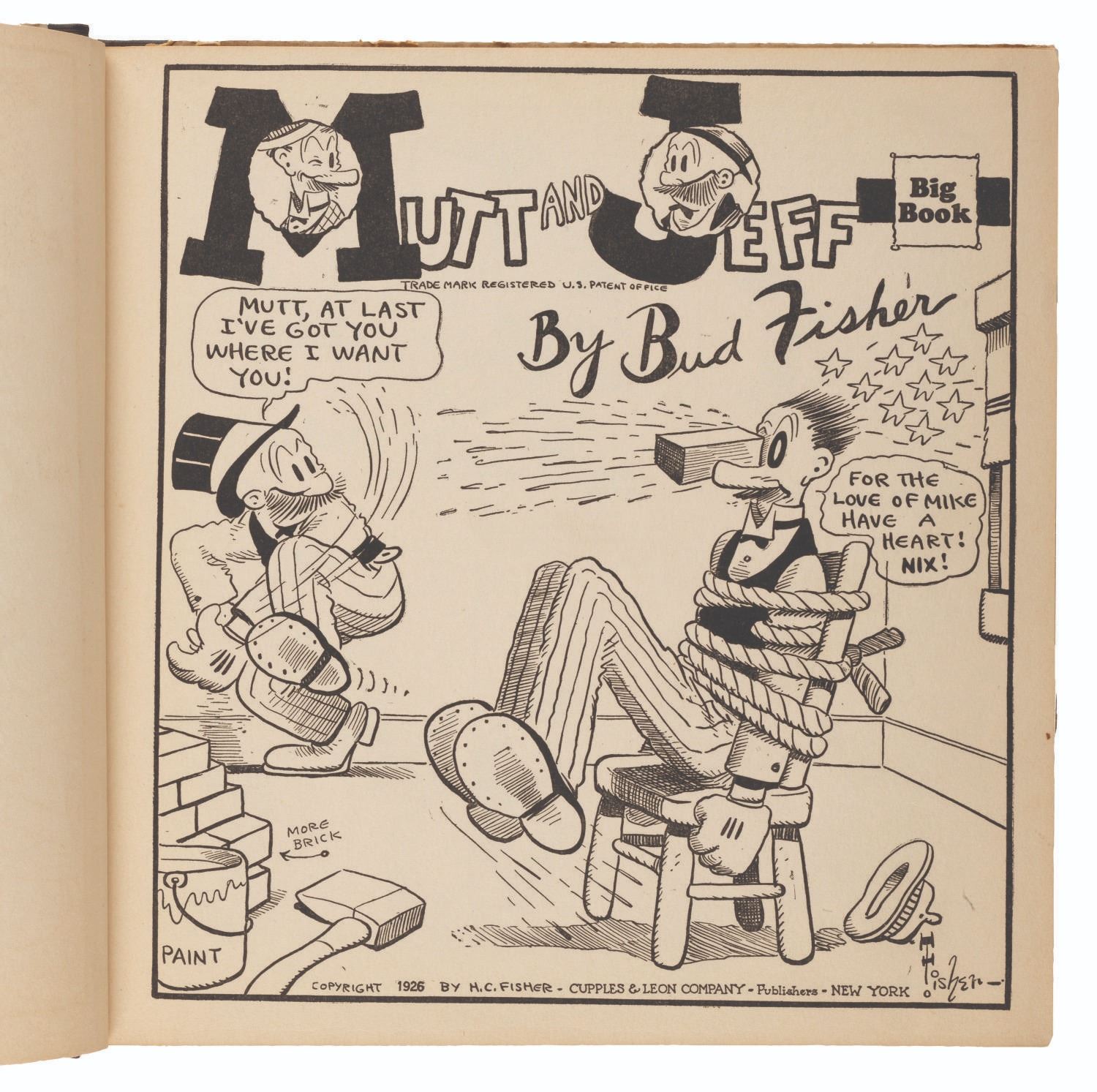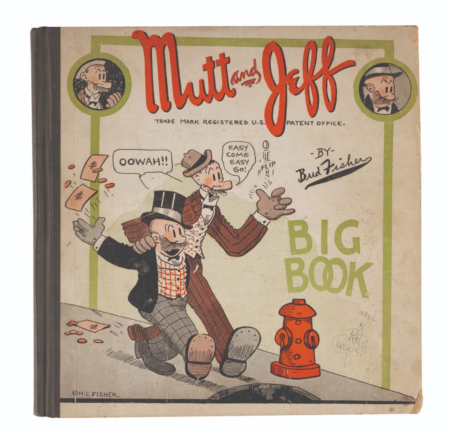 (Fisher, 1926) Bud Fisher, a sports cartoonist with the San Francisco Chronicle, created the Mutt and Jeff Comic Strip in 1907. The wildly successful strip was syndicated nationwide until 1983. Fischer's drawing style and humor heavily influenced 13-year-old Bob Clampett and this Mutt and Jeff Big Book was an important part of his personal collection his entire life. The 10" x 10" book has a hand-written "owned by Robt. Clampett" at the bottom right side of the cover (written by a very young Clampett) as well as stamps on the inside "property of Bob Clampett" that were added much later. The book is in very good condition with expected wear from use. An excellent example of this book.