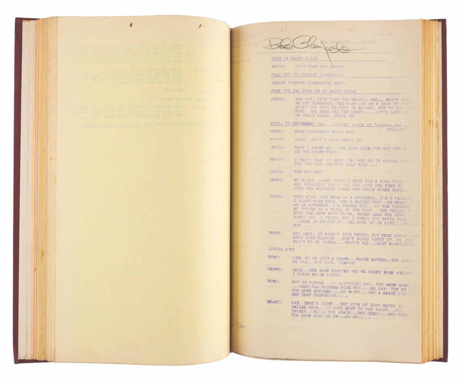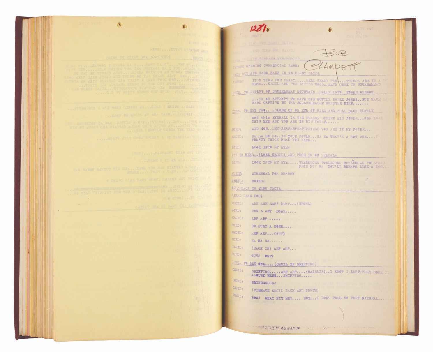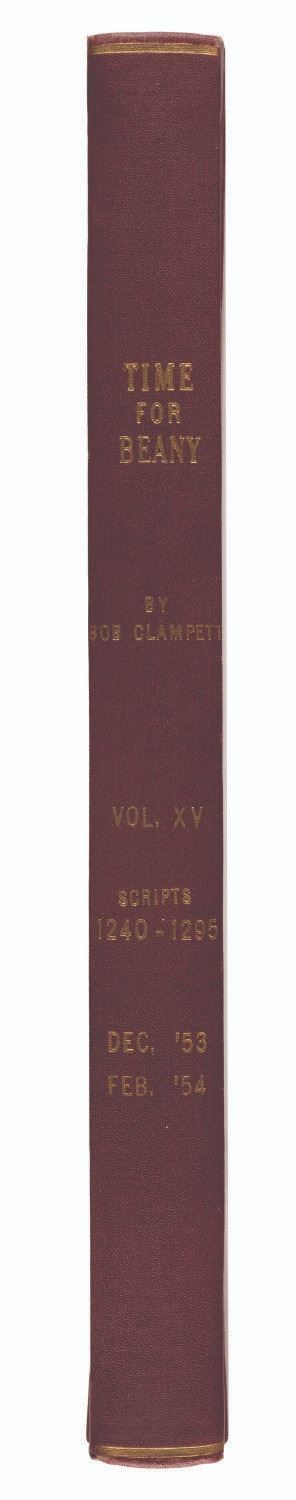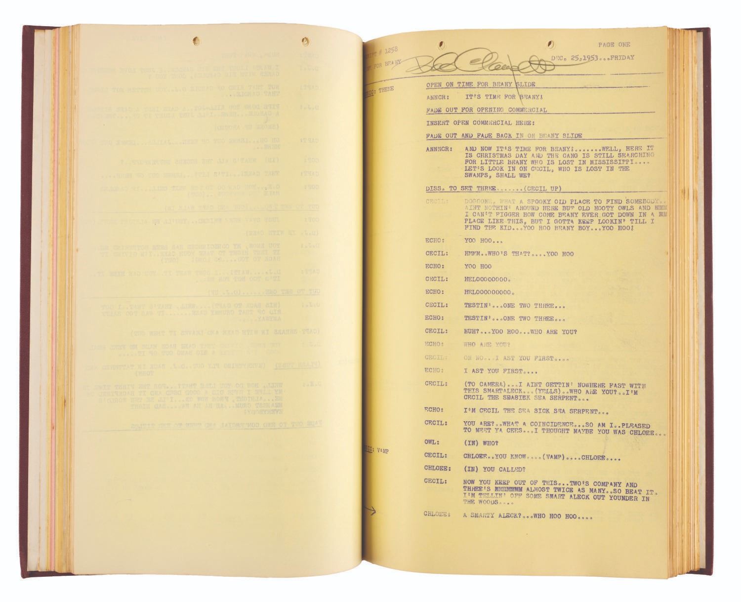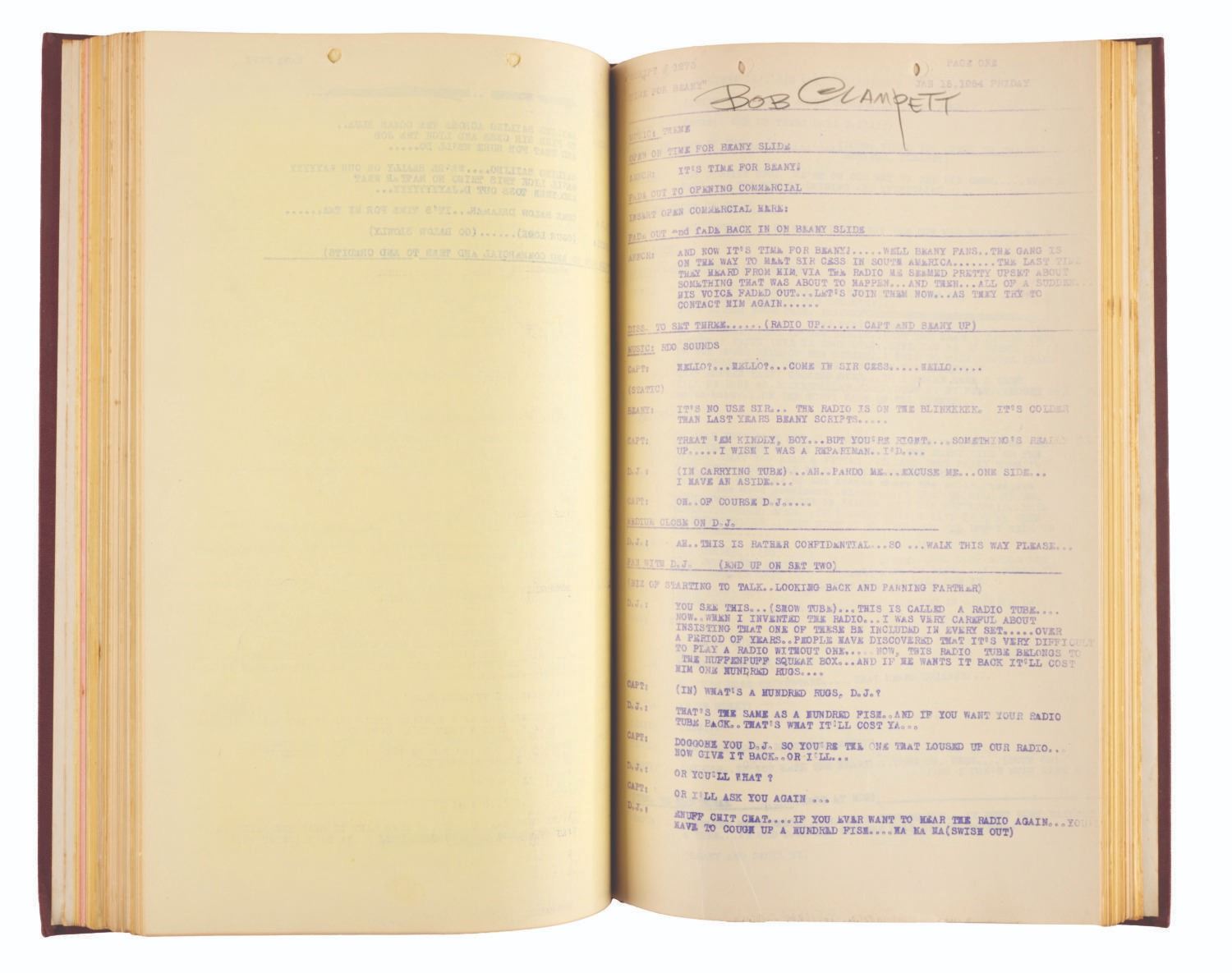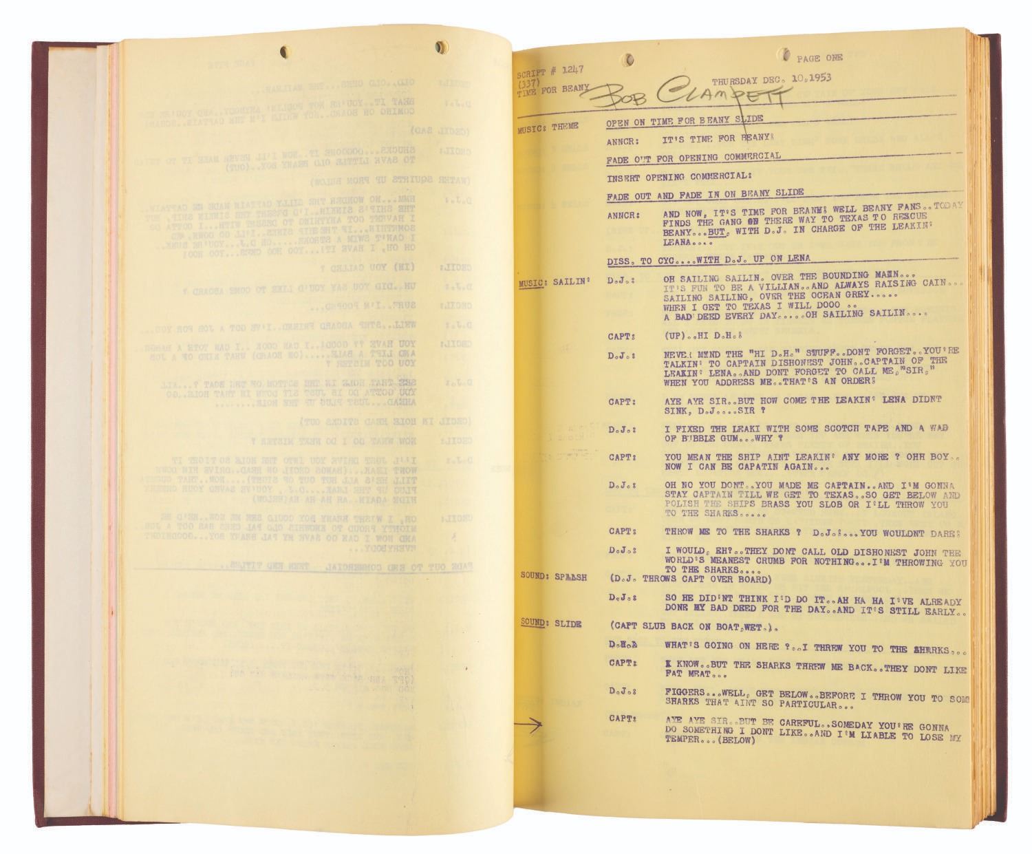 (Clampett, 1953-54) A custom hard-cover book with 55 of Bob Clampett’s personal, production-used scripts for “Time for Beany,” from December 1953 through February 1954. Each mimeograph script has been signed in graphite by Clampett and contains handwritten notations from production. Measuring 14.25” x 9” x 1.25” thick, the book is in very good condition with shelf wear and light stains to the edges of the pages.