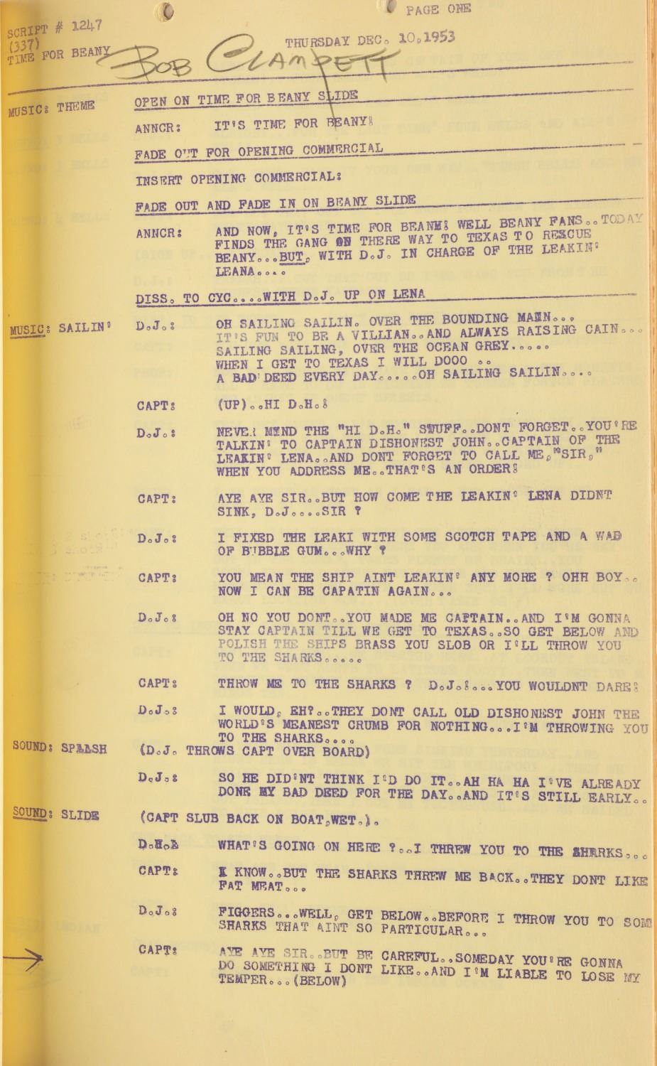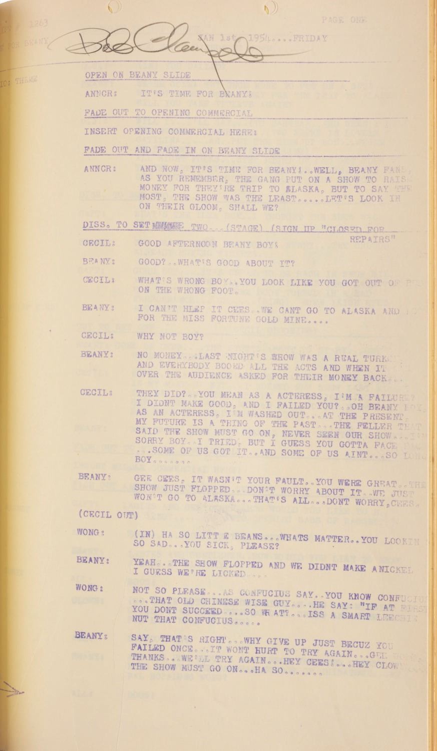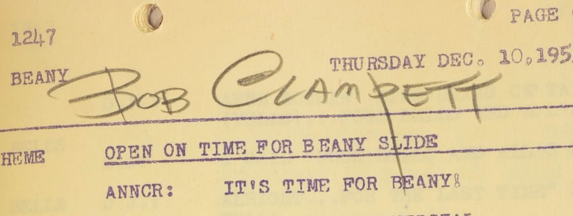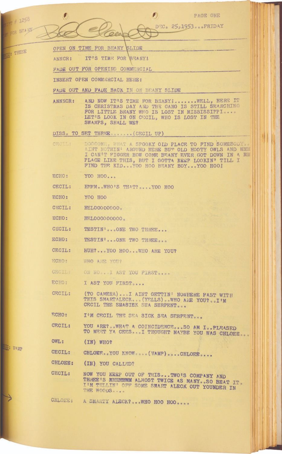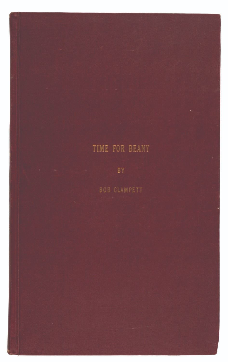 (Clampett, 1953-54) A custom hard-cover book with 55 of Bob Clampett’s personal, production-used scripts for “Time for Beany,” from December 1953 through February 1954. Each mimeograph script has been signed in graphite by Clampett and contains handwritten notations from production. Measuring 14.25” x 9” x 1.25” thick, the book is in very good condition with shelf wear and light stains to the edges of the pages.