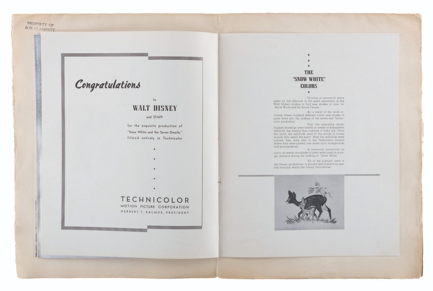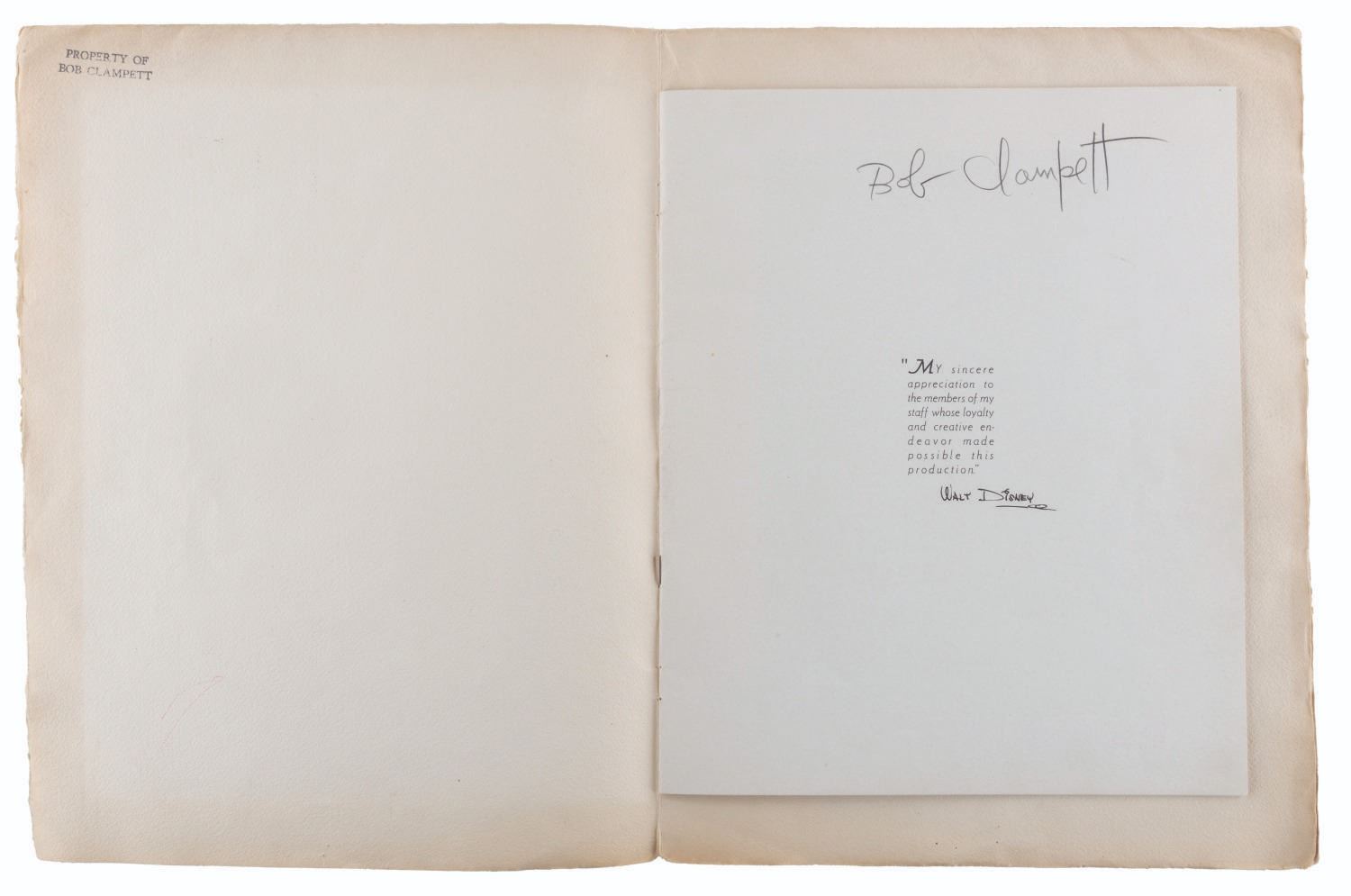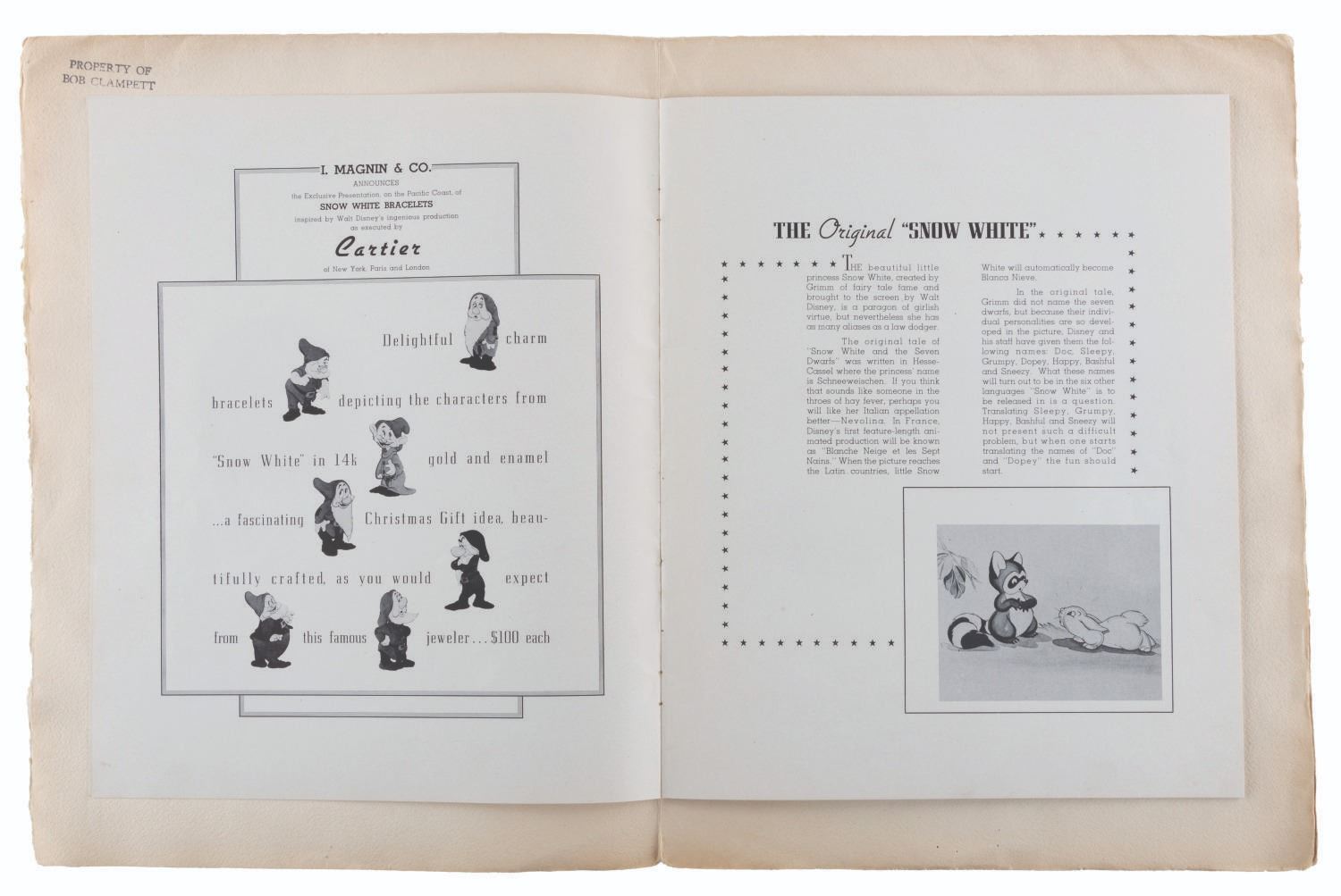 (Disney, 1937) An original program from the world premiere of “Snow White and the Seven Dwarfs.” Held at the Carthay Circle Theatre on December 21, 1937, the star-studded event was attended by celebrities and industry professionals including Shirley Temple and Charlie Chaplin. This program belonged to attendee Bob Clampett, who signed the first page in graphite and stamped the interiors of the front and back covers “Property of Bob Clampett.” Measuring 10” x 13”, the program is in good condition with edge wear, spotting, creases, and discoloration from age.