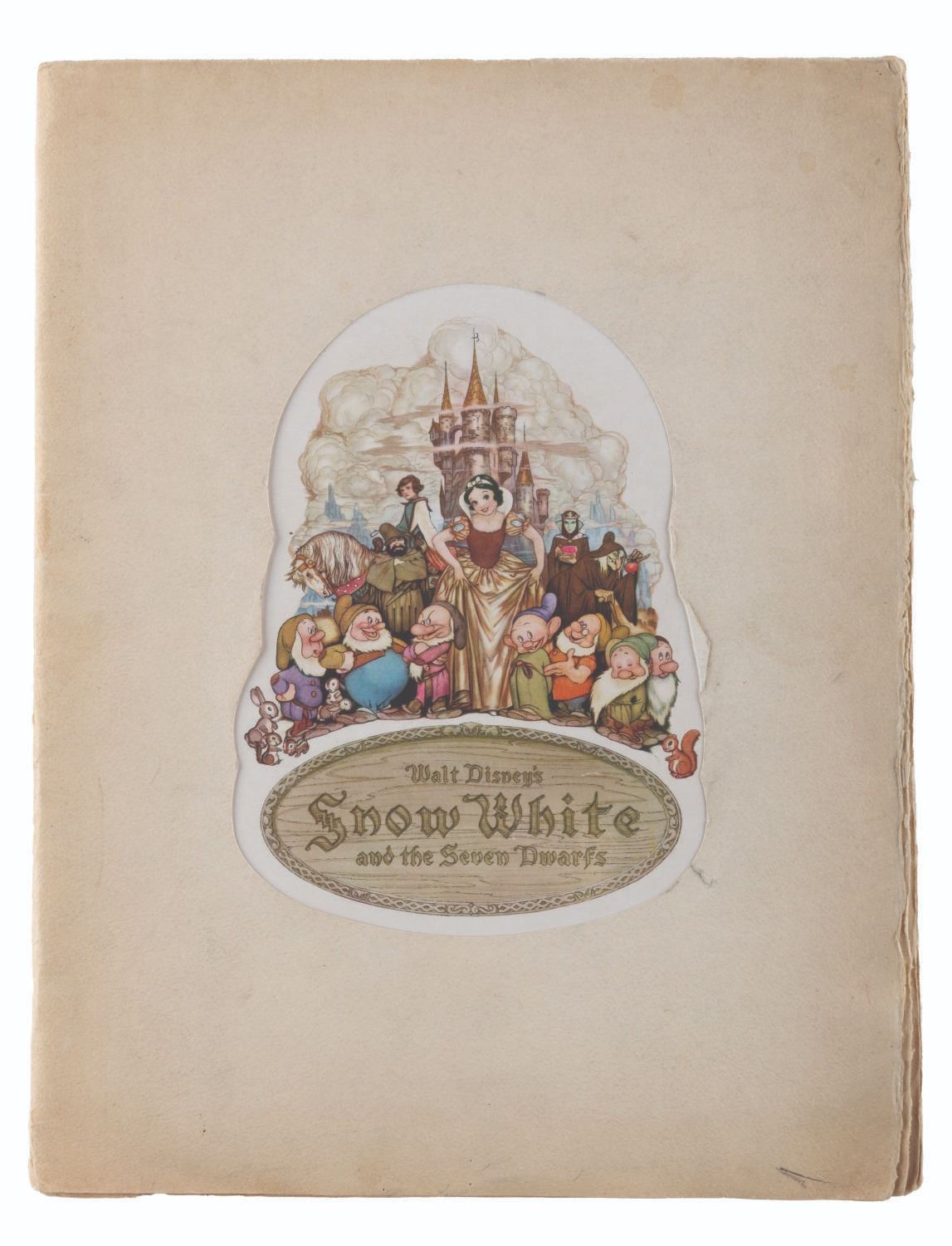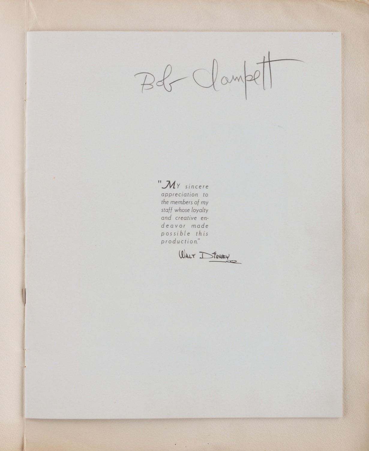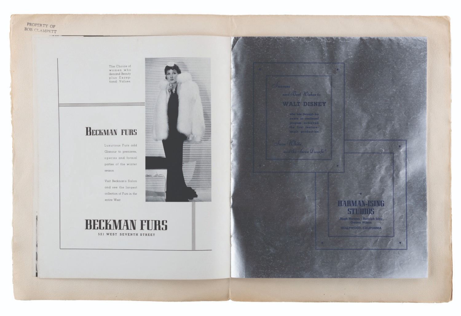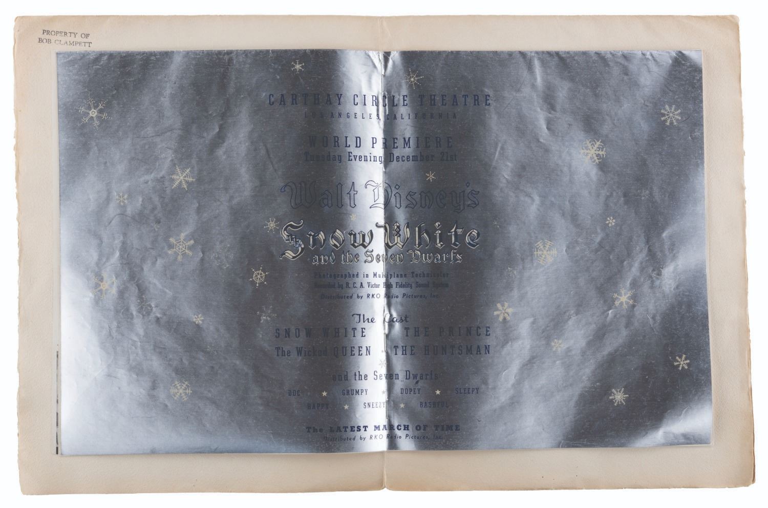 (Disney, 1937) An original program from the world premiere of “Snow White and the Seven Dwarfs.” Held at the Carthay Circle Theatre on December 21, 1937, the star-studded event was attended by celebrities and industry professionals including Shirley Temple and Charlie Chaplin. This program belonged to attendee Bob Clampett, who signed the first page in graphite and stamped the interiors of the front and back covers “Property of Bob Clampett.” Measuring 10” x 13”, the program is in good condition with edge wear, spotting, creases, and discoloration from age.