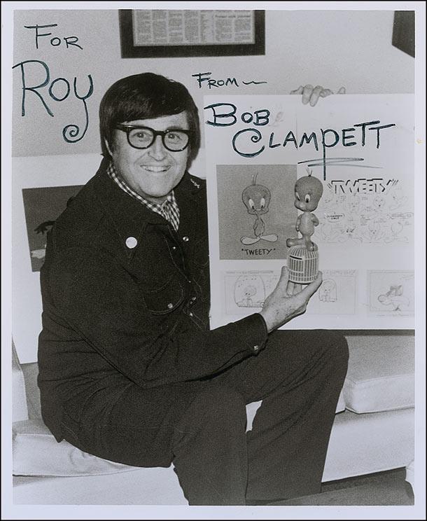 Glossy 8 x 10 photo of the animator and Tweety, signed and inscribed in black felt tip, “For Roy, From-Bob Clampett.” In fine condition, with some light surface marks.
