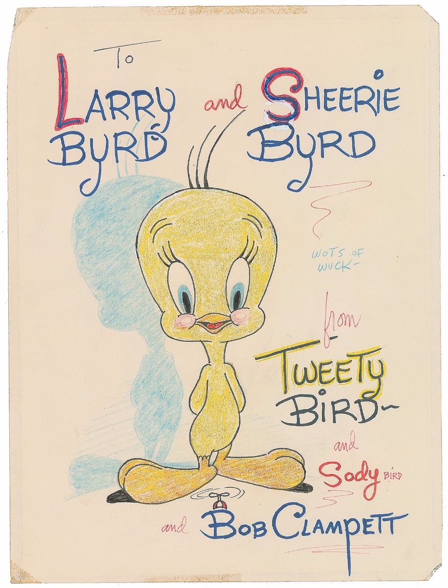 (Warner Brothers Studios, circa 1955–1963) Scarce original drawing by Bob Clampett featuring Tweety accomplished in felt tip and colored pencil on an off-white 9 x 12 sheet, signed and inscribed, “To Larry Byrd and Sheerie Byrd, Wots of Wuck, from Tweety Bird and Sody Bird and Bob Clampett.” In fine condition, with some paper loss and mounting remnants to edges.
