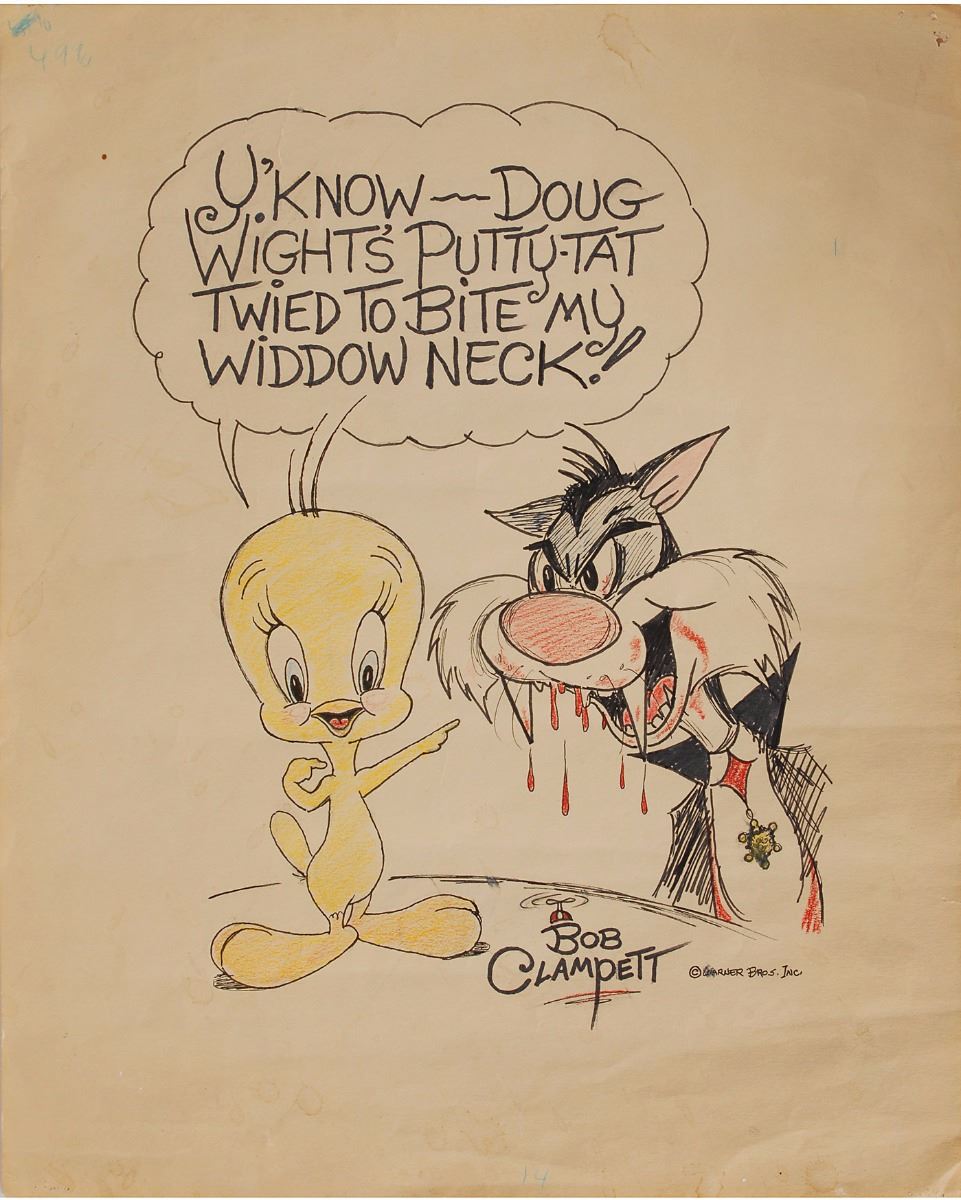 (Warner Brothers Studios, circa 1960s) Large original drawing by Bob Clampett featuring Tweety and a vampiric Sylvester, accomplished in felt tip and colored pencil on an off-white 14 x 16.75 sheet, inscribed in black felt tip within a speech bubble, “U’know—Doug Wight’s putty-tat twied to bite my widdow neck!,” and signed in the lower right, “Bob Clampett.” In very good to fine condition, with uniform toning and light scattered staining.