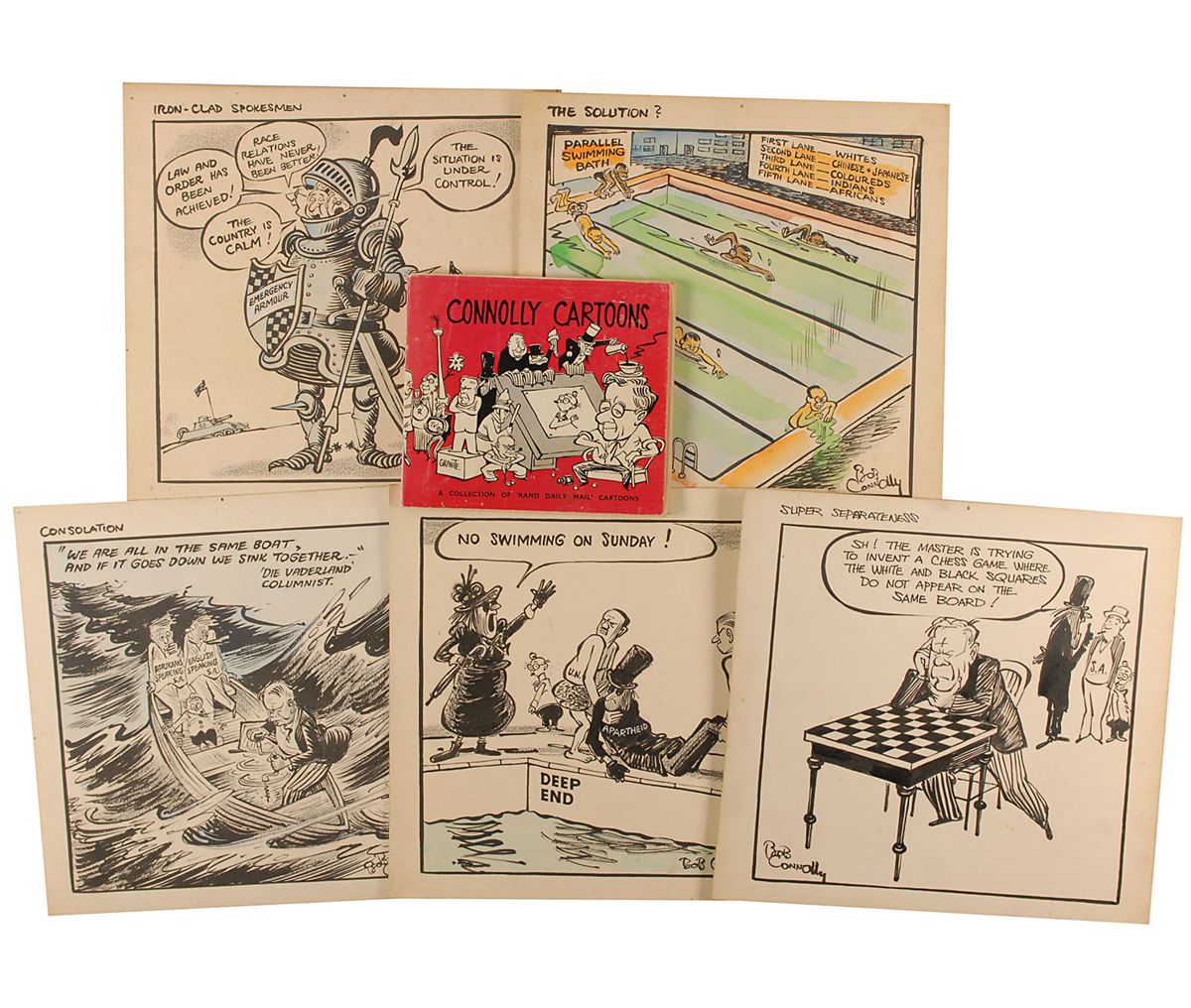 Original hand-drawn ink artwork for five single-panel comic strips, each on heavy 12 x 11.5 artist’s cardstock and signed in a lower corner. Light toning and soiling to borders, otherwise overall fine condition. Accompanied by a book entitled Connolly Cartoons, featuring his comics from the Rand Daily Mail.