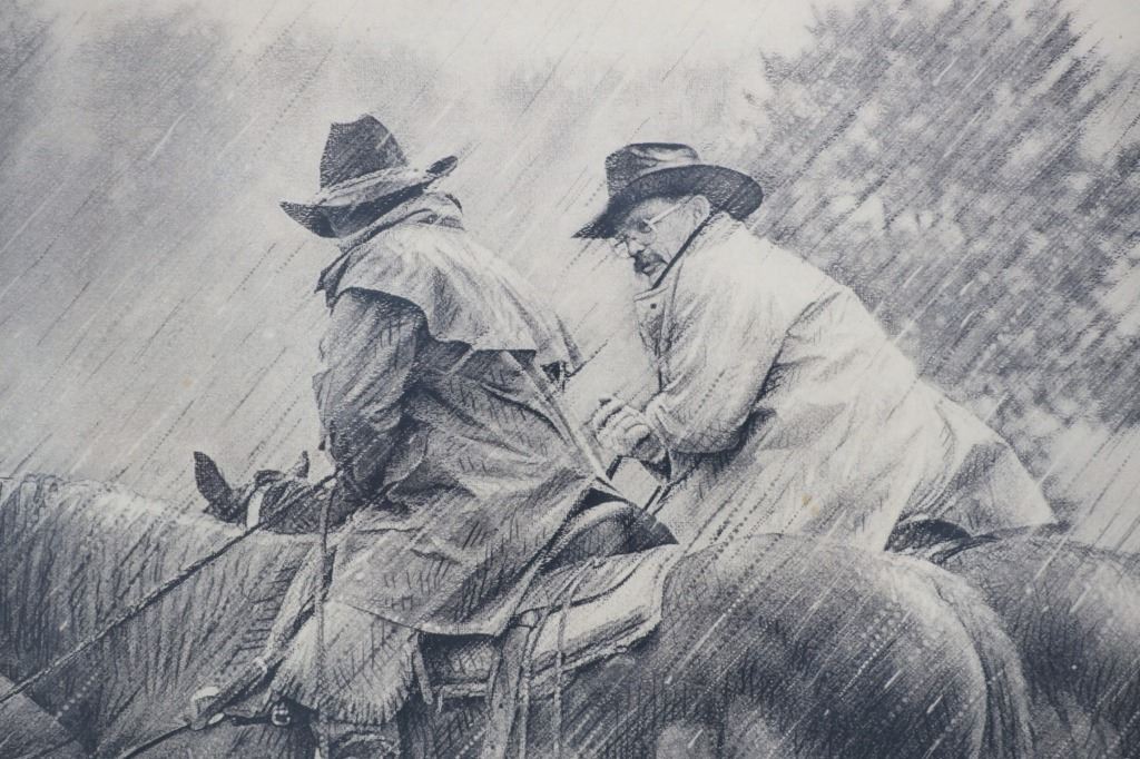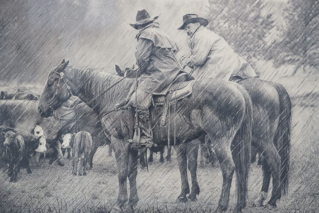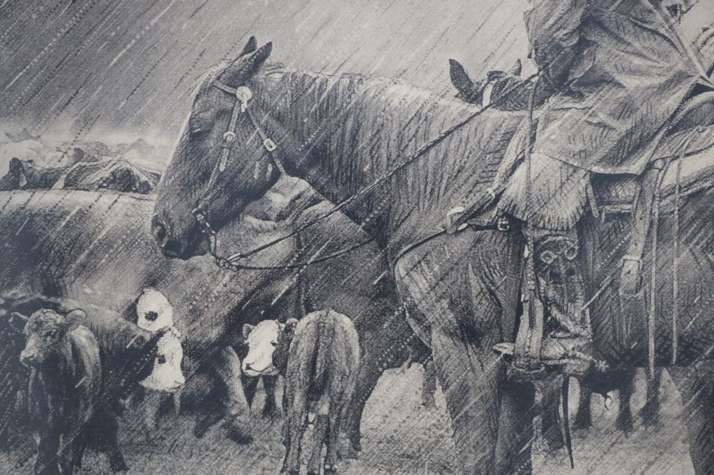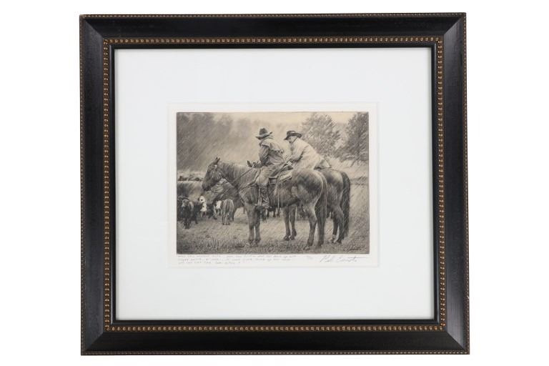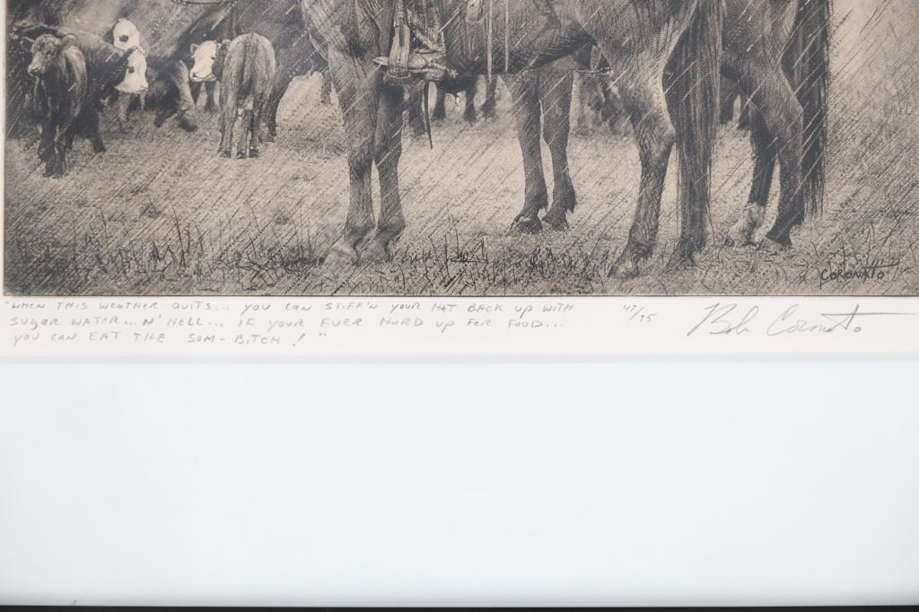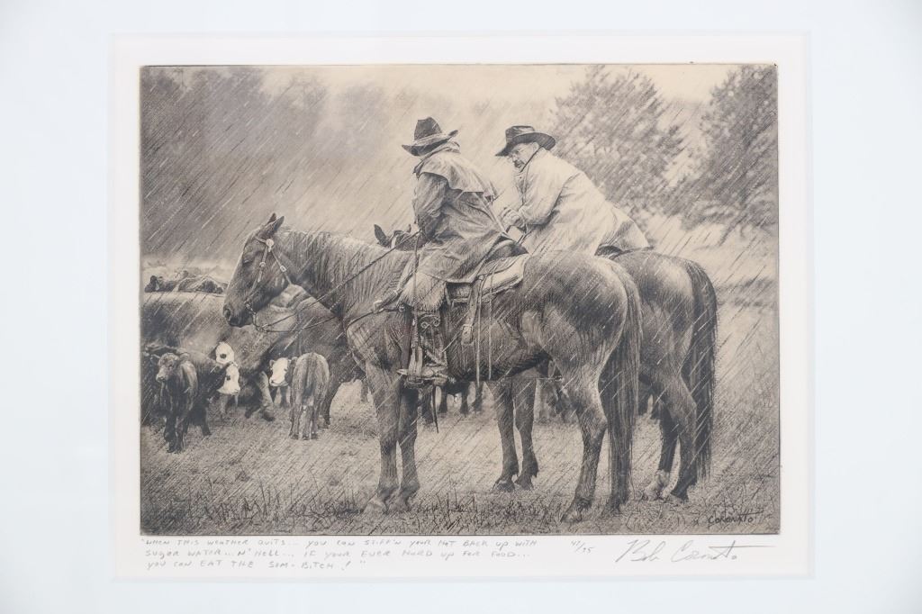 Featured in this lot is this etching called " When this weather quits... you can stiff'n your hat back up with sugar water.. n'hell... if your ever hard up for food... you can eat the som-bitch!" by Bob Coronato. The etching features a scene of two cowboys in the rain taking care of a herd of pairs. The etching is marked as follows: "When this weather quits... you can stiff'n your hat back up with sugar water.. n'hell... if your ever hard up for food... you can eat the som-bitch!" - 47/95 (and is signed in the bottom right hand corner. Bob Coronato is a contemporary American artist known for his vivid depictions of the modern-day American West, blending traditional techniques with scenes of cowboy life and Native American culture. Born in 1970, Coronato has spent much of his life in the West, particularly in Wyoming and South Dakota, immersing himself in the culture he portrays. One of the distinctive aspects of his work is his use of intaglio printmaking, especially his finely detailed chine-collé editions, where thin, hand-tinted papers are bonded to a thicker backing sheet during the etching process. These editions add subtle texture and warmth to his often gritty or nostalgic scenes, and have become highly collectible for their craftsmanship and limited availability. Coronato’s chine-collé prints reflect his dedication to merging historical techniques with contemporary storytelling in Western art. The condition of this of this framed etching is well preserved with no obvious signs of damage and shows a well preserved overall condition. The measurements of this framed etching is 21 1/2" x 23 3/4" and the 10 1/8" x 12 5/8". The collective weight of this framed etching is 6lb 4oz.