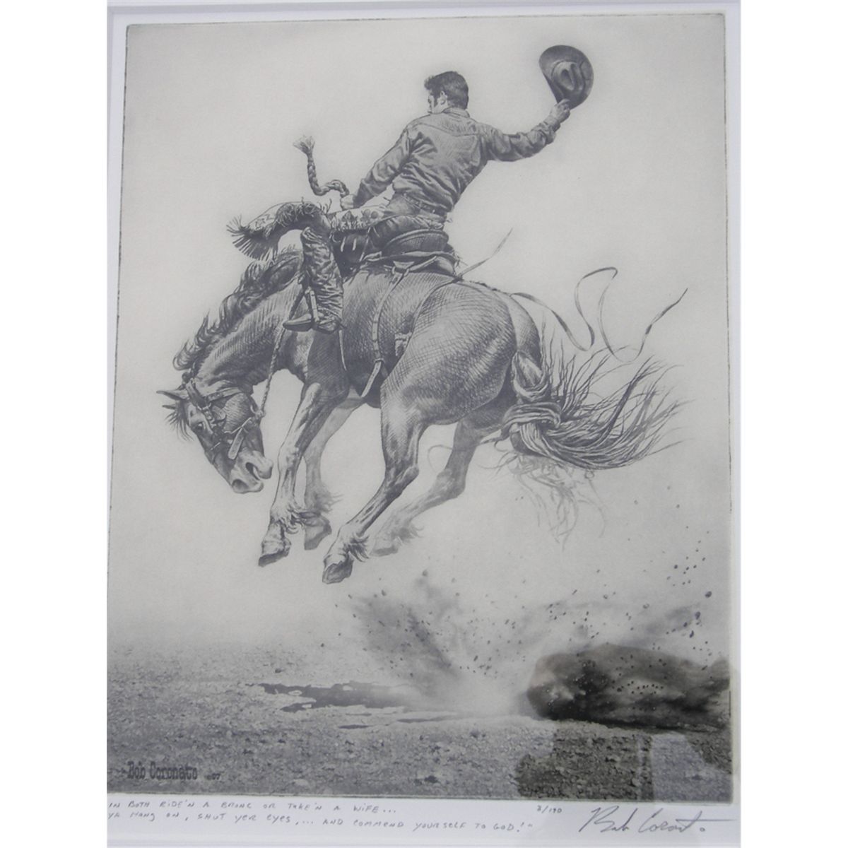 Bob Coronato Chine Colle Etching of Cowboy on Bucking Bronc, #8/190, "In Both Ridi'n a Bronc or Take'n a Wife...Ya Hang on, Shut Yer Eyes,...and Commend Yourself to God!", 13 1/2" x 10 5/8", Estimate: $800- $1200