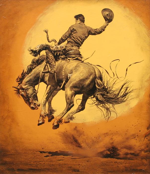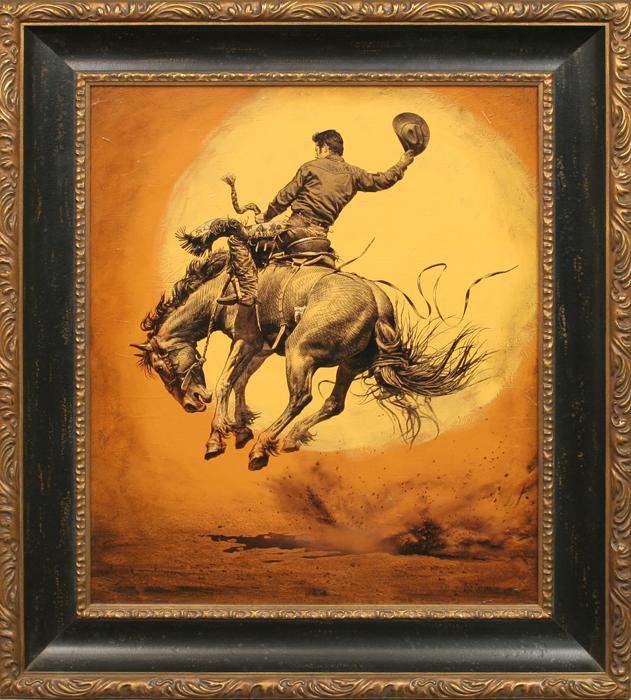 Bob Coronato (b. 1970). In Both Ridin A Bronc and Takin' a Wife.... 28" x 23" mixed medium on board. signed lower right. Condition Report: Fine condition.