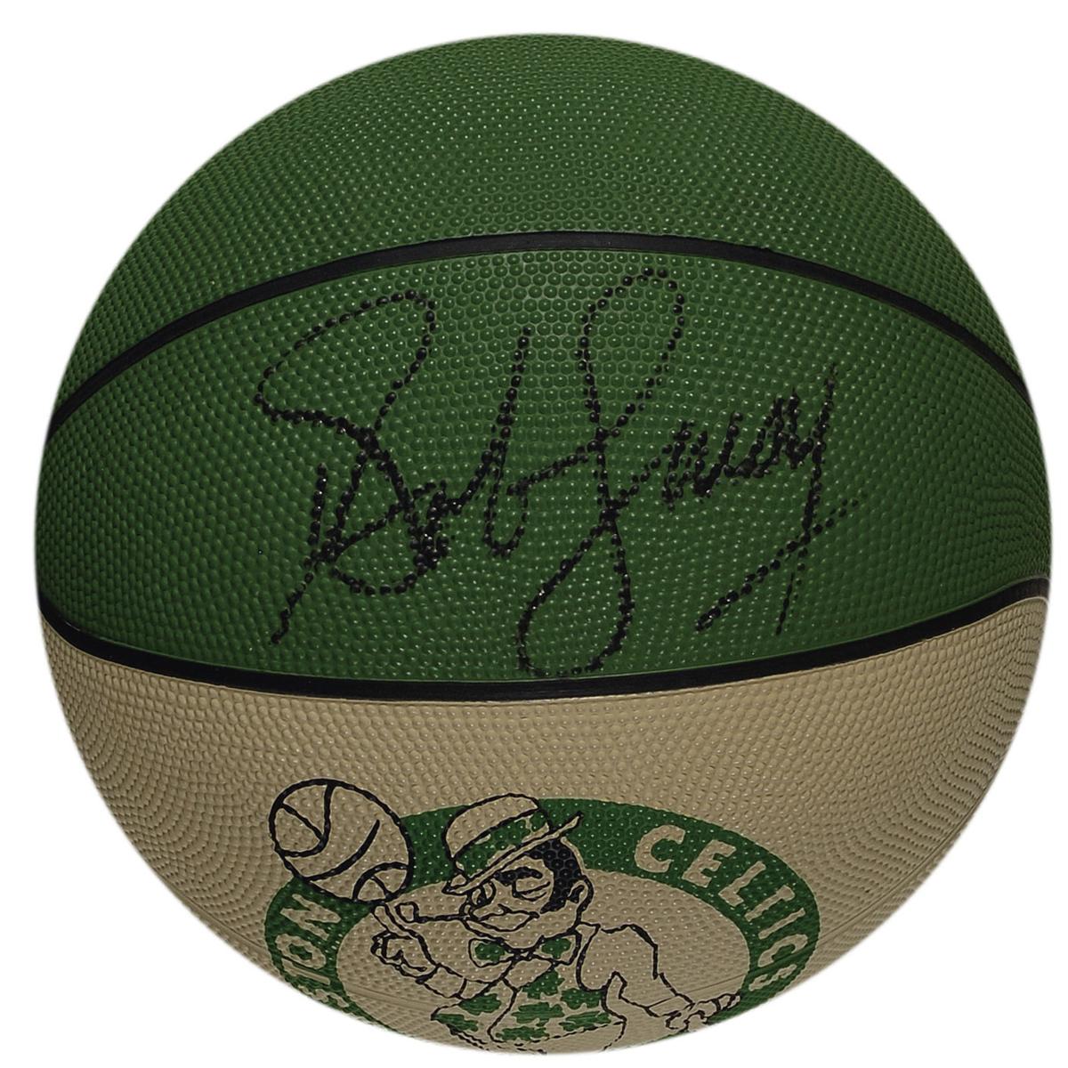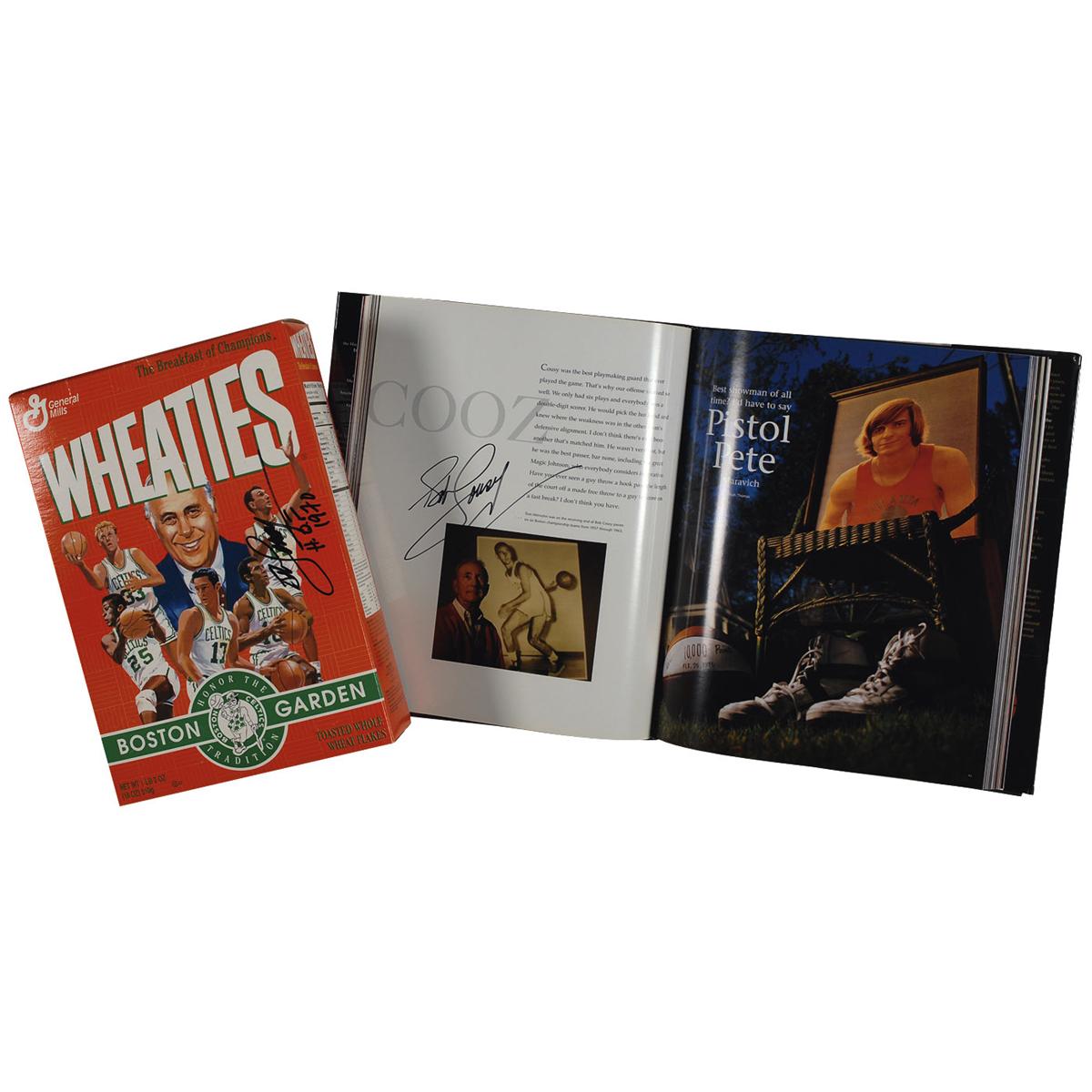 Three items: Spalding Boston Celtics logo basketball signed in black felt tip on a side panel; hardcover copy of NBA at 50, signed in black felt tip on page 80; and an unopened box of Wheaties cereal honoring the Boston Garden, signed in black felt tip, “Bob Cousy, H.O.F. 1970.” In overall fine condition.