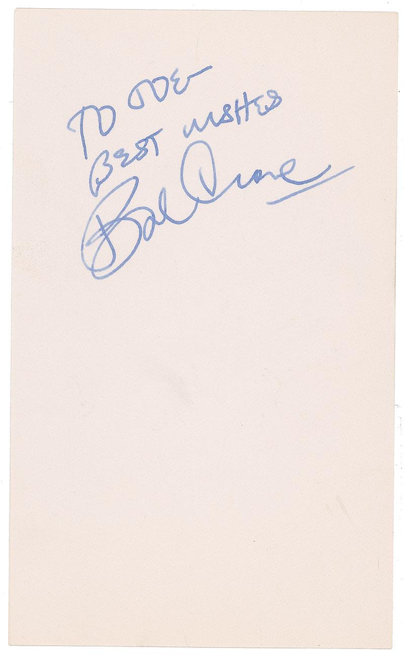 Actor (1928–1978) best known for his role on the Nazis-as-lovable-buffoons sitcom Hogan’s Heroes. His violent, still-unsolved beating death was the subject of the 2002 film Auto Focus. Vintage ink in-person signature and inscription, “To Joe, Best wishes, Bob Crane,” on an off-white 3 x 5 card. In very fine condition.