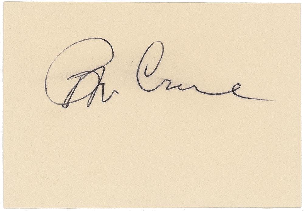 Actor (1928–1978) best known for his role on the Nazis-as-lovable-buffoons sitcom Hogan’s Heroes. His violent, still-unsolved beating death was the subject of the 2002 film Auto Focus. Ink signature, “Bob Crane,” on an off-white 3.75 x 2.5 slip. Some light wrinkling and a couple trivial brushes to signature, otherwise fine condition.