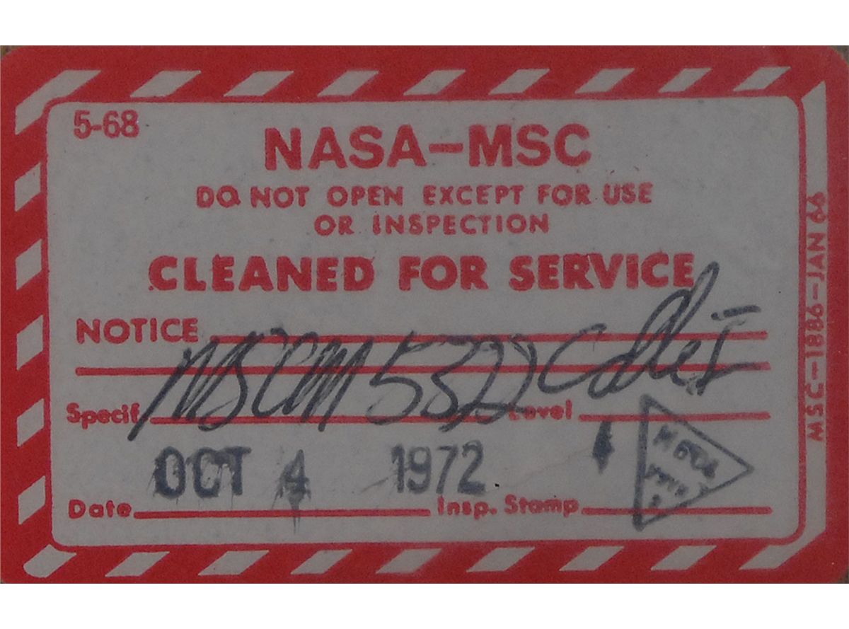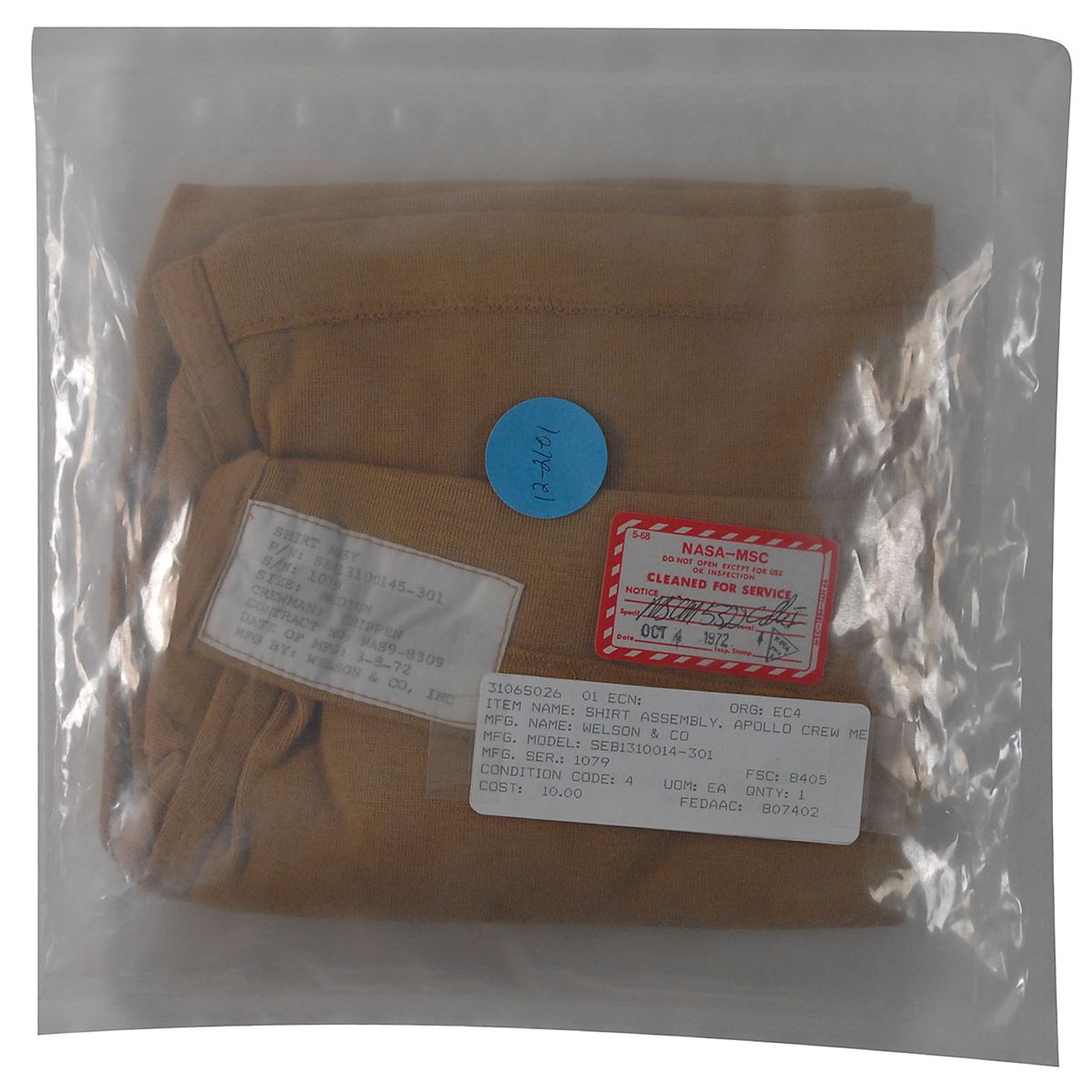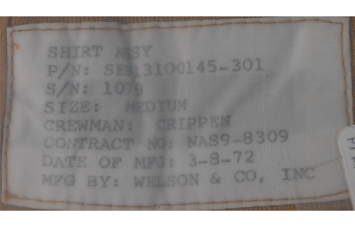 Bob Crippen’s ASTP shirt assembly. Mustard color shirt from the Apollo Applications Program (AAP) (Skylab flights 2, 3, 4, and ASTP) used for either training or backup. Label on shirt reads: “Shirt Asst…Size: Medium; Crewman: Crippen.” Shirt is sealed in plastic with a NASA-MSC “Cleaned for service” sticker affixed to the inner bag, stamp-dated October 4, 1972. Shirt was found in bonded storage in 2003 at the Johnson Space center and later deacquisitioned to a museum, which then gifted it to the consignor, with a property label affixed to outside of bag. In fine condition.