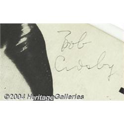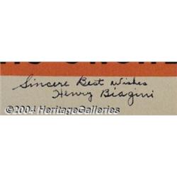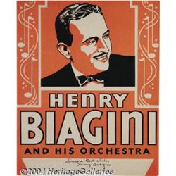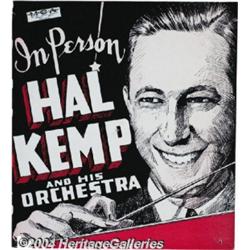 <B>Bob Crosby and Henry Biagini Signed Window Cards, plus Hal Kemp Unsigned Window Card.</B></I> Bob Crosby founded his band "The Bobcats" after leader Ben Pollack decided to give it up. Bob Crosby and "The Bobcats" were a tight-knit unit that played mostly Dixieland. The band's biggest hit was "Big Noise From Winnetka," featuring the drums and bass of Ray Beauduc and Bob Haggart, respectively. Bob Crosby had a very successful career even though he always lived in the shadow of his older brother, Bing Crosby. Henry Biagini was the leader of the Casa-Loma Orchestra. Although he was eventually ousted from the Casa-Loma group in favor of Glen Gray, Henry continued to lead dance orchestras throughout the 1930s and the 1940s, until his career was cut short in a tragic 1944 auto accident. This card features a large image of Crosby, and Bob has signed to the right of it. Pinholes would matte or frame out. This orange card features a likeness of Biagini and is signed by him at the bottom. Here again, pinholes could mat or frame out. In the late 1920s, Hal Kemp's orchestra, based in New York City, toured the United States and Europe. Drummer-singer Skinnay Ennis was the band's best known singer, and he scored a huge hit with the band when they recorded "Got a Date With An Angel." Hal Kemp died tragically in 1940, in an auto collision in California while diving to a job with the band. This unsigned card showing Kemp with baton in hand has the usual pinholes, plus some holes and chips at the bottom that could matte or frame out. <I>Accompanied by COA from Jazz and Big Band expert Larry Rafferty</B></I>. 3 items <BR><BR><B>Important notice:</B> Heritage usually auctions material at the rate of 200-250 lots per hour. On some occasions eBay Live bid software or the Internet may not be able to keep up with the pace of the auction. We recommend placing a realistic absentee bid now as insurance to avoid disappointment. Occasionally the auctioneer may eliminate or reject an eBay Live bid, and the auctioneer may also reopen a lot after the close of the eBay live bidding (usually because we missed an audience bid), and may reject your bid even if it shows you as the winning bidder. By bidding via eBay Live, you agree that Heritage may award the lot to another bidder at its sole discretion under the circumstances described above or any other reasonable circumstances. Since eBay bids are not shown to us until we open the lot on the floor, we treat those bids just like floor bids. In most cases the floor responds before the eBay bid is presented to us, due to Internet lag time, so for consistency we have made it a policy that floor bids are always considered first over tie eBay live bids. Also please note that all Heritage lots purchased through eBay Live carry a 24.5% Buyer's Premium. Please make sure you read the Terms and Conditions before you bid.