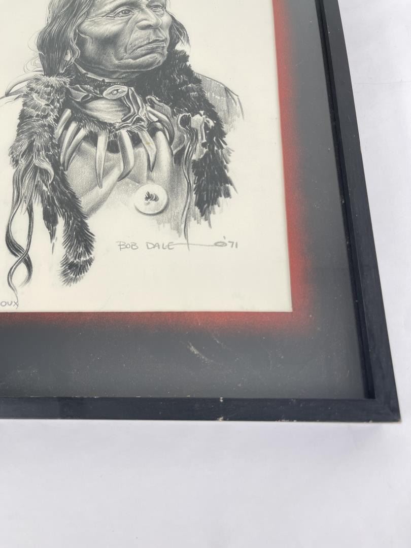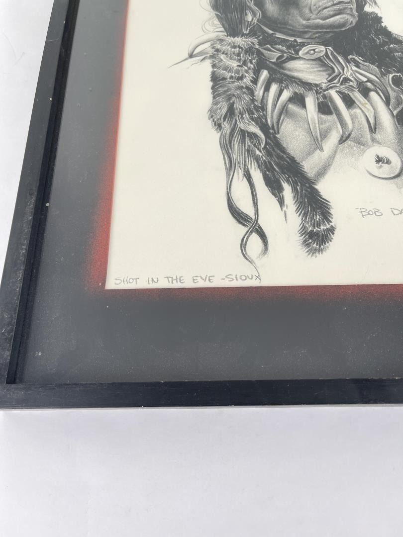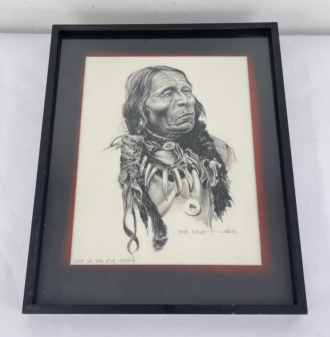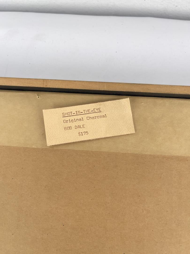 Shot in the Eye. 16 3/4" by 20 3/4" framed. Bob Dale was born in San Antonio, Texas in 1927 and grew up in Brownsville, Texas. He began drawing from the time he could hold a pencil and hasn't stopped since. He entered the United States Navy in 1943 and served on the USS Boston until 1945 when he returned home to San Antonio. After the war was over, Dale attended GI Art School for four years where he excelled in all forms of media. Before he had even graduated, Dale was hired as the editorial cartoonist at the San Antonio Express-News. He enjoyed this post for nearly 35 years. Bob Dale became well-known in San Antonio for his work at the paper, where, in addition to editorial cartoons, he produced a popular series called "San Antonio Profiles". He created very distinct cartoons for the newspaper and made a good impact on South Texas. His style has been regarded as very consistent and recognizable from a mile away. While at the Express-News, Dale received many offers to go east and work at several different newspapers, but he refused. He was content with his job in San Antonio and couldn't bear to leave Texas. After retiring from the San Antonio Express-News in 1985, Bob Dale and his wife, June, moved to Alaska. He worked as the editorial cartoonist for the Anchorage Times for two years, after which they, not surprisingly, became homesick and returned to San Antonio. Those who know Bob Dale consider him to be a "real cowboy" because of his love for the history of the American past. In addition to his work as a cartoonist, Dale is also well-known for his timeless Western art. He is admired and respected due to his historical quest for correctness and artistic perfection. Allard Auction Collection Inv: AX