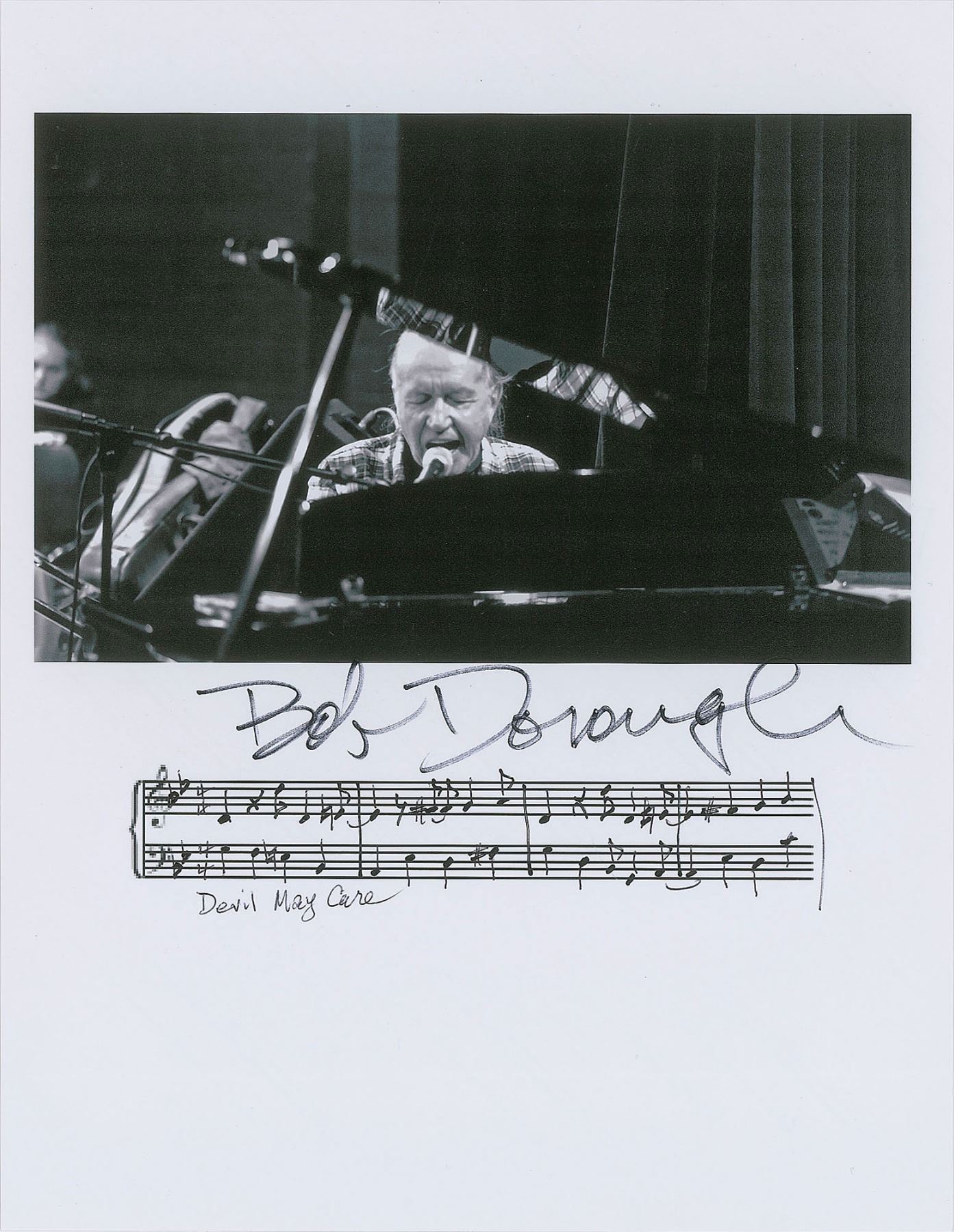American bebop and cool jazz vocalist, pianist, and songwriter (1923–2018) who is best known as the composer and performer of songs from the long-running TV cartoon Schoolhouse Rock! AMQS on a white 8.5 x 11 sheet bearing an image of Dorough singing from behind a piano, signed in black felt tip by Dorough, who adds eight bars of music from the song "Devil May Care." In very fine condition.