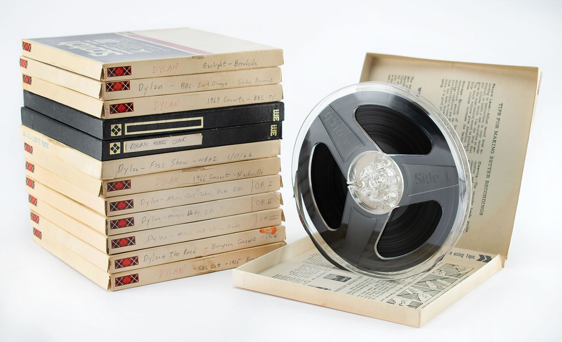 Tony Glover’s collection of 15 rare 1/4-inch reel-to-reel audio tape bootlegs of various Bob Dylan demos, rehearsals, interviews, press conferences, and concerts from the early to mid 1960s. The tapes, which are annotated in ink and felt tip by Glover with title, track listing, and background notes, are listed as follows: