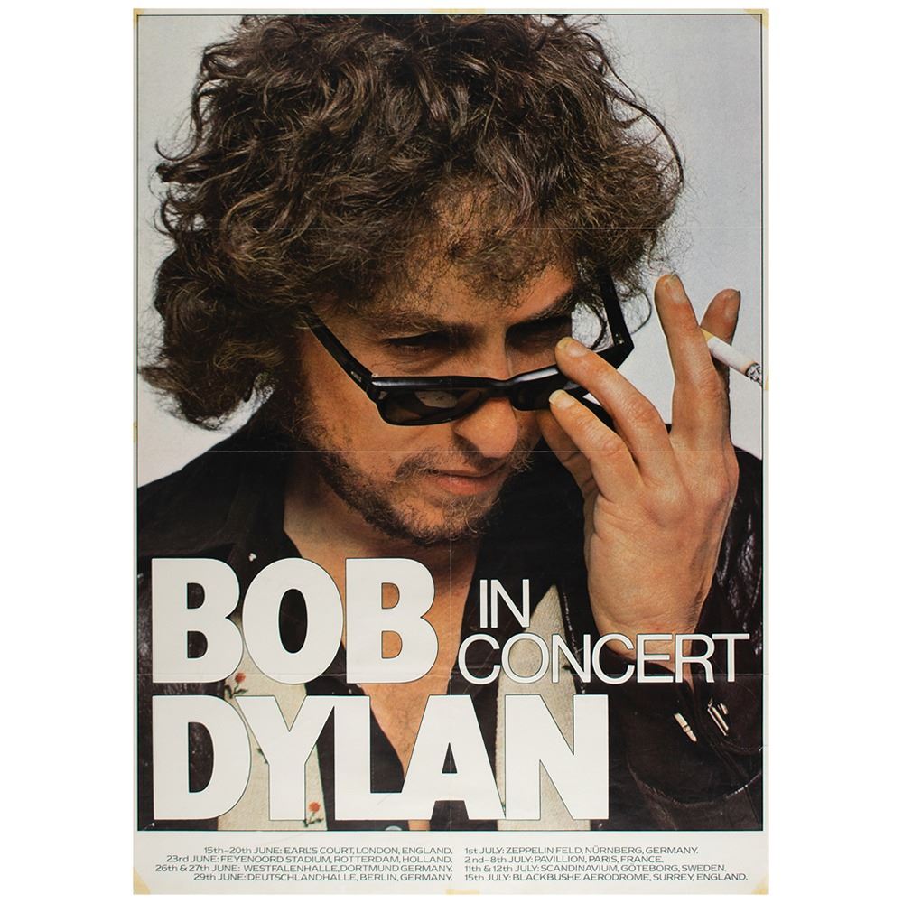 Scarce original color 23.75 x 33 poster for Bob Dylan’s month-long summer tour of Europe held between June 15 and July 15, 1978, which features large white text, “Bob Dylan, In Concert,†and a great background image of Dylan lowering his sunglasses with a cigarette between two fingers. Rolled and in very good to fine condition, with intersecting folds, a short tear to right edge, and old tape stains to corners and edges; the imagery remains quite clear.