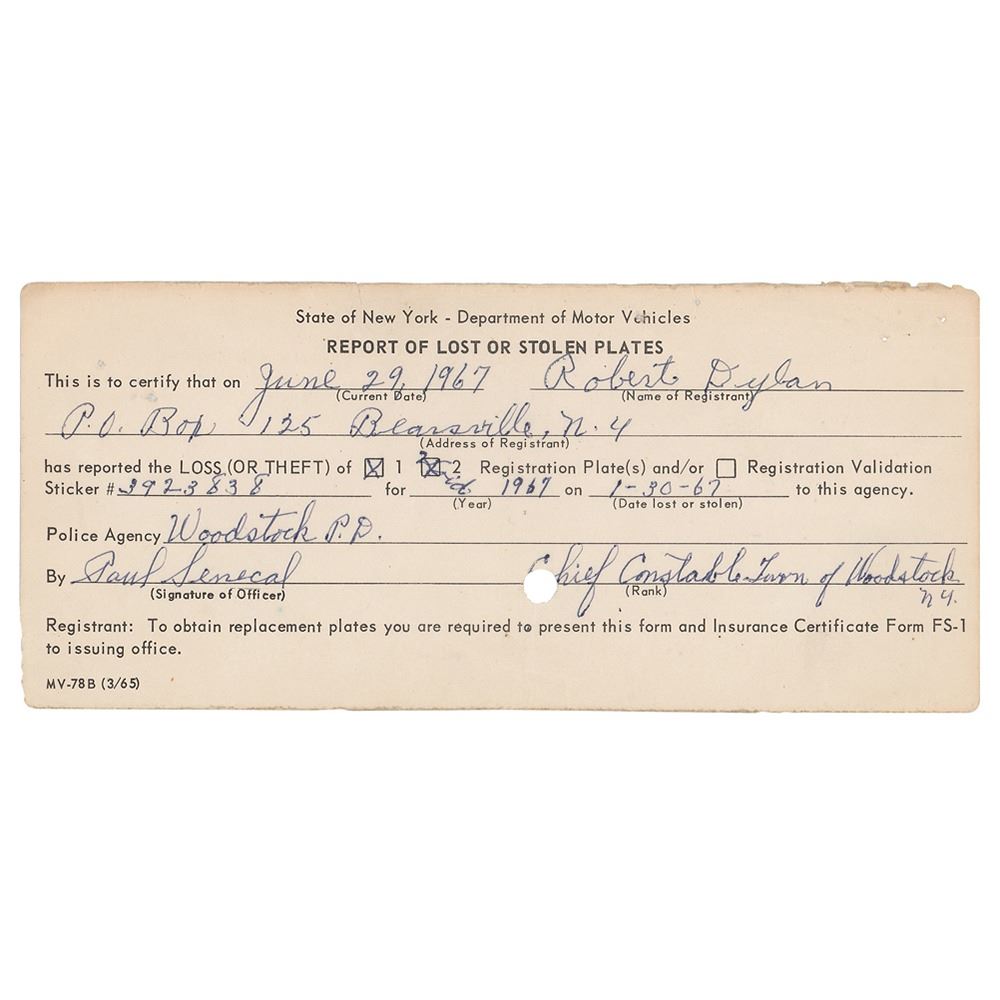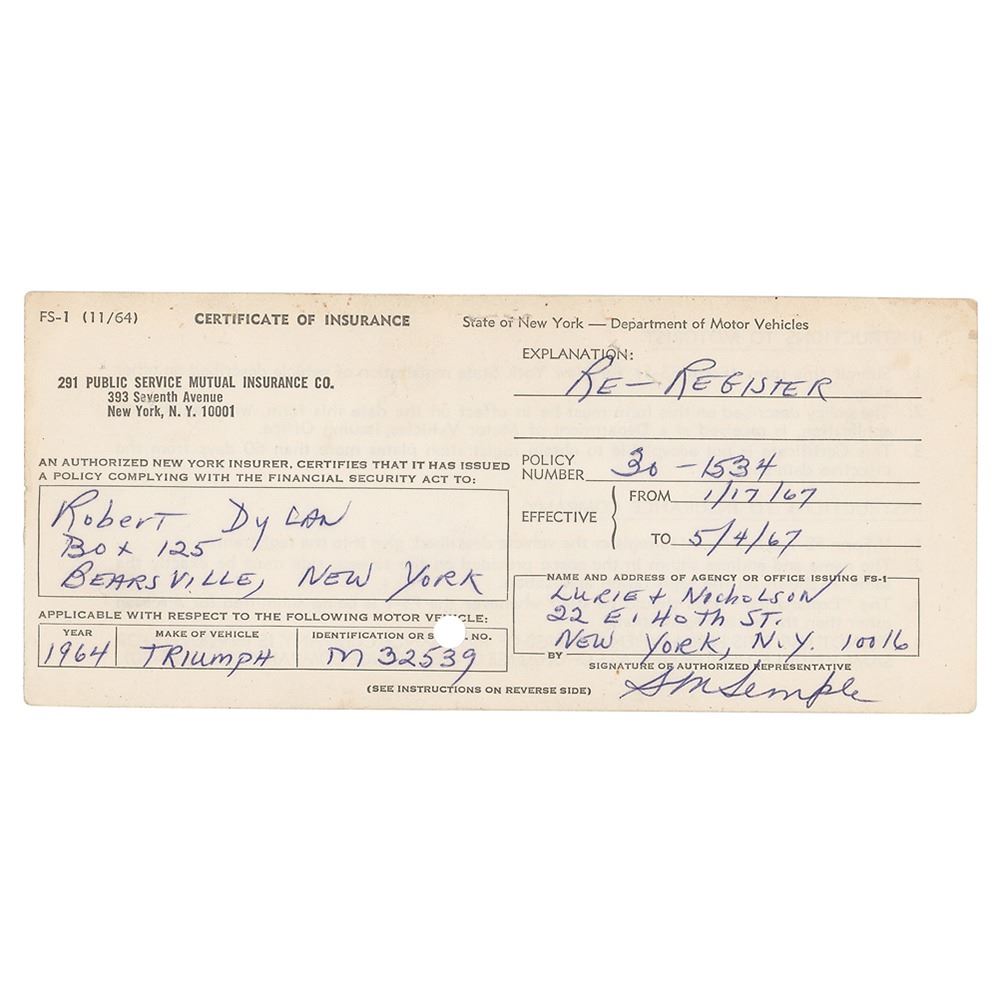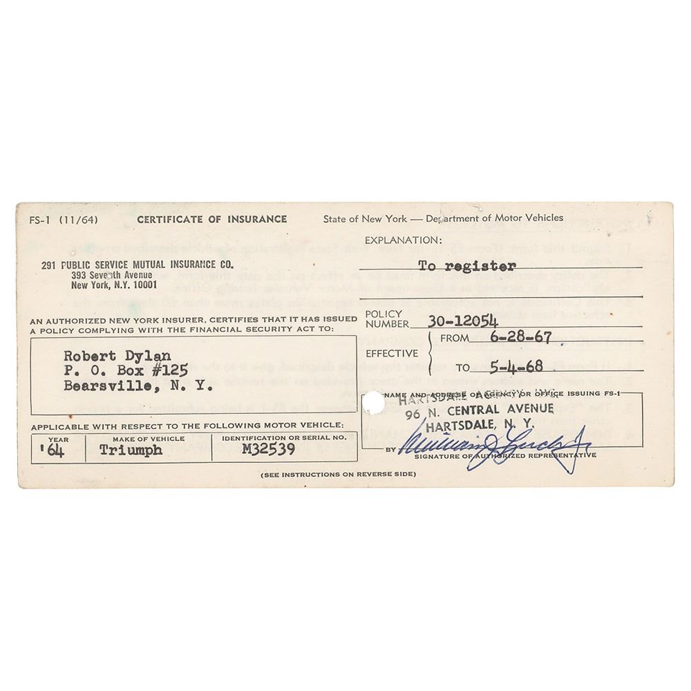 Scarce set of three documents from the “State of New York—Department of Motor Vehicles,” relating to Bob Dylan’s motorcycle accident on July 29, 1966, when he crashed his 500 cc Triumph Tiger 100 motorcycle near his home in Woodstock, New York. The unsigned documents, each one page, 7.5 x 3.25, filled out in type or in the hand of a DMV employee, include: a “Certificate of Insurance” with a “Re-Register” explanation, issued to “Robert Dylan, Box 125, Bearsville, New York,” policy number “30-12054,” from January 17, 1967 until May 4, 1967, for the following motor vehicle: Year “1964,” Make of Vehicle “Triumph,” and ID or Serial No. “M32539.” The second document, which is also a “Certificate of Insurance” and features much of the same information, is for “To register” with a date from June 28, 1967 until May 4, 1968. The third document is a “Report of Lost or Stolen Plates,” issued to the Woodstock Police Department, which reads: “This is to certify that on June 29, 1967 Robert Dylan…has reported the loss (or theft) of 1 Registration Plate…#3923838 for 1967 on 1-30-67.” Each document is signed at the conclusion by an officer or DMV representative. In overall fine condition.