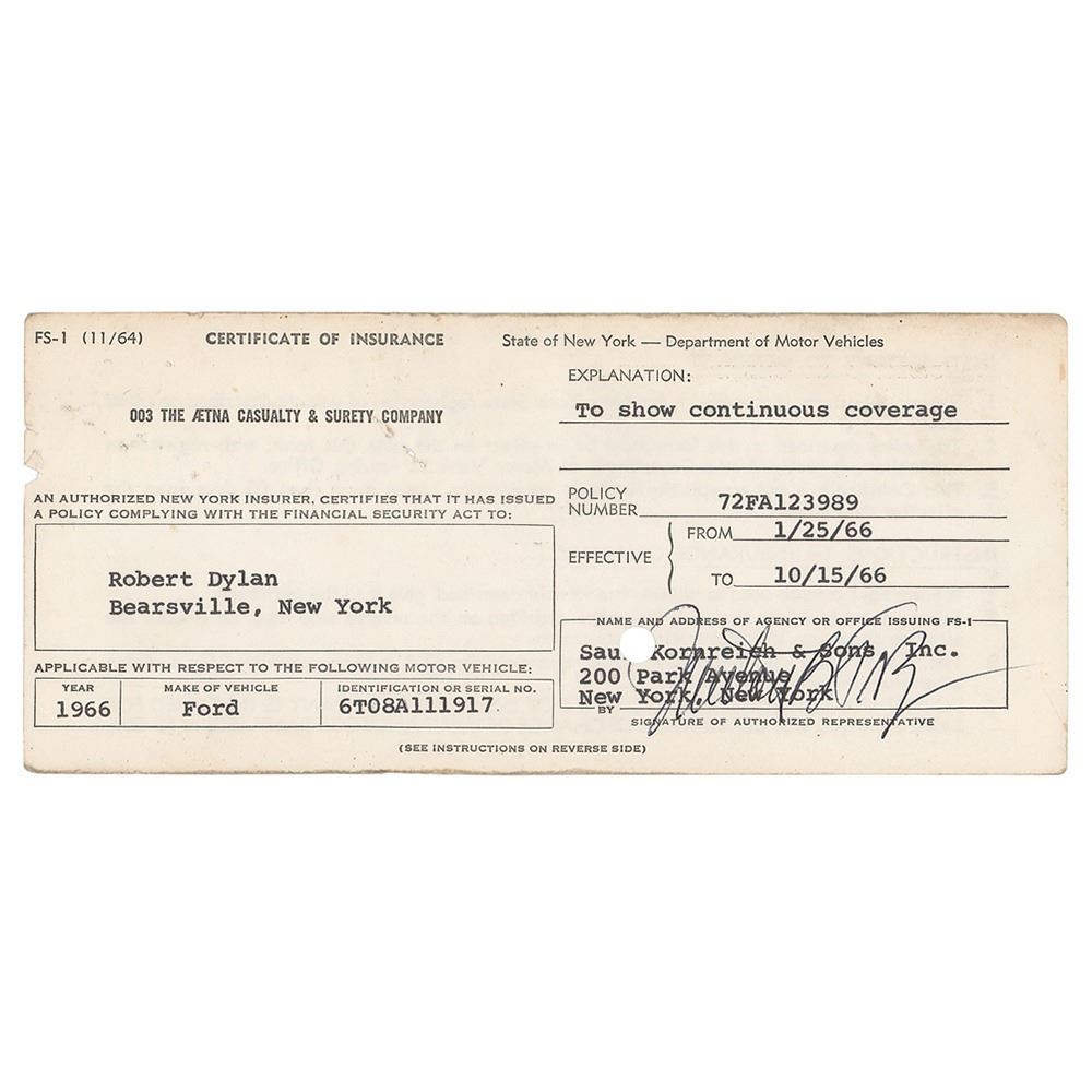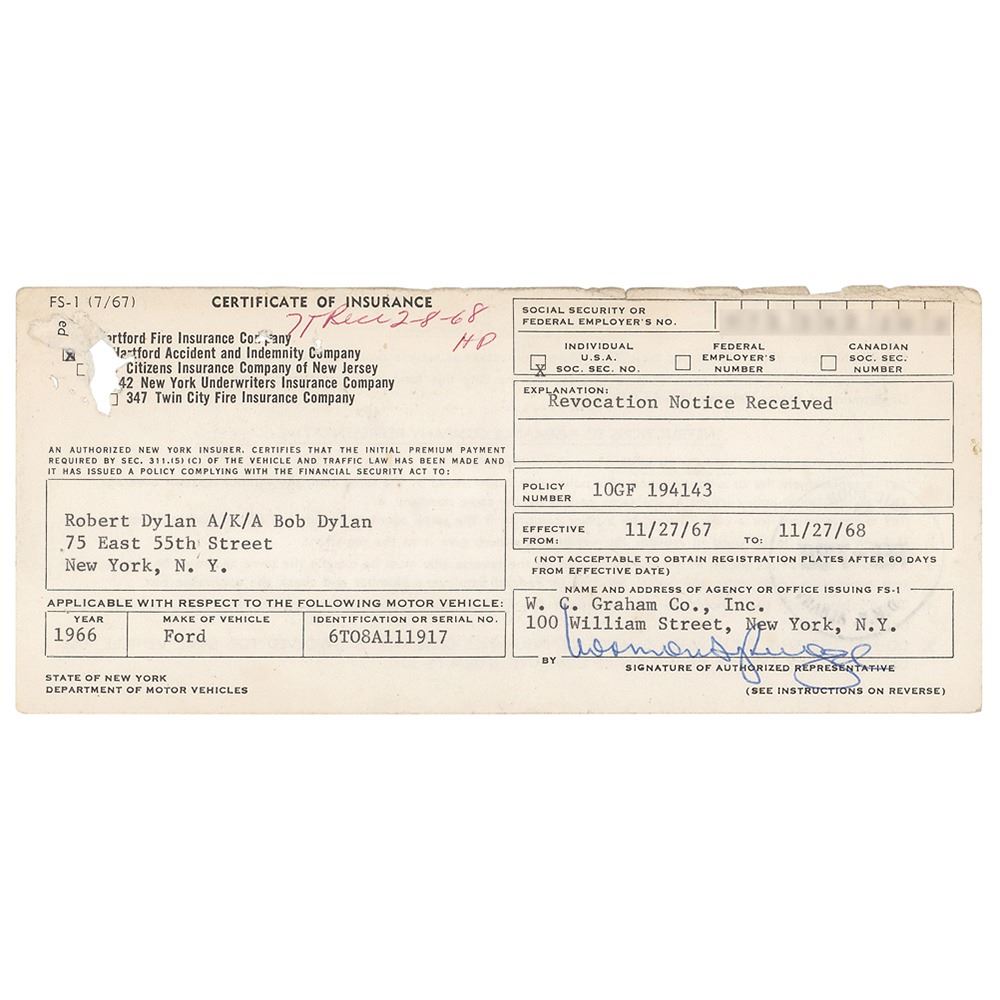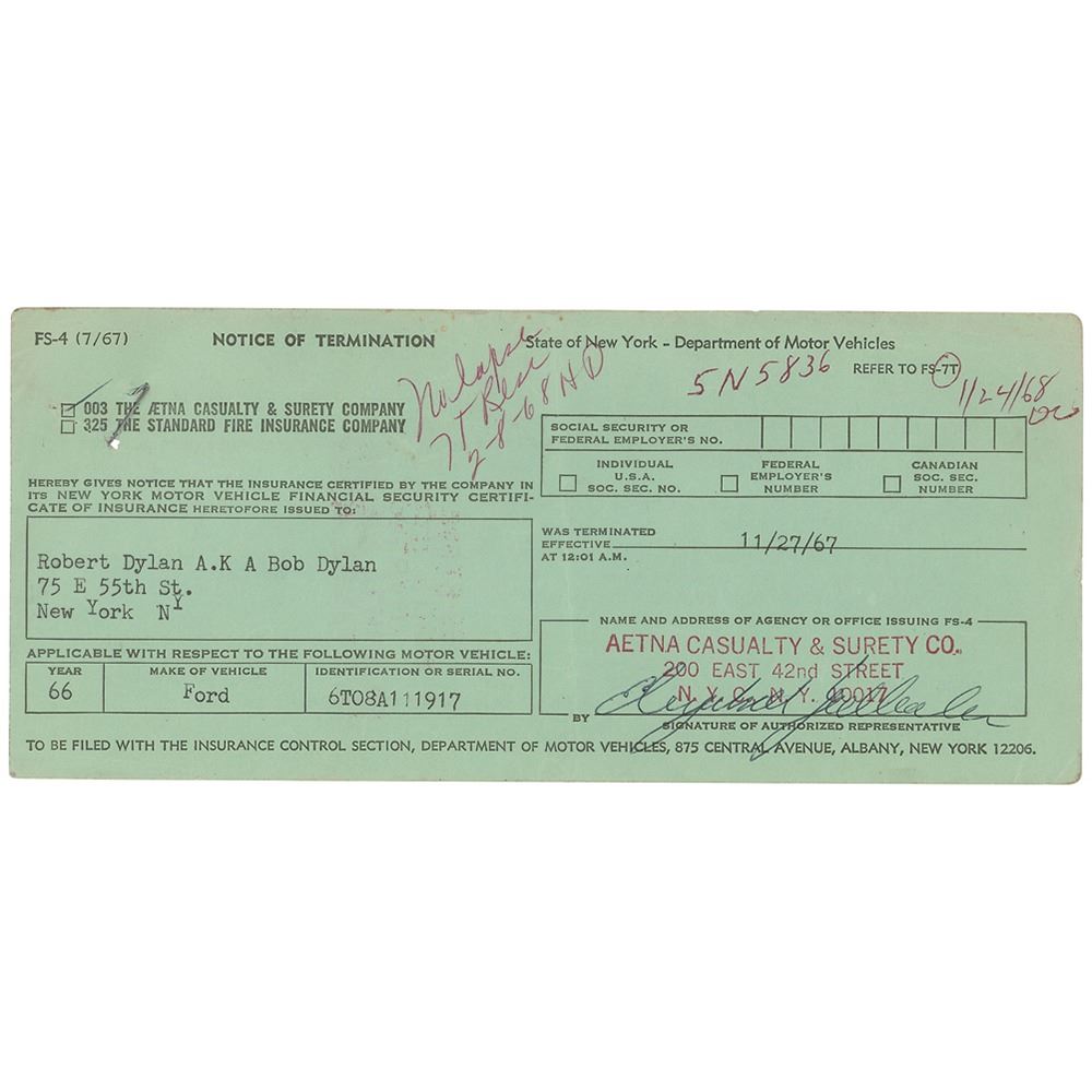 Group lot of three documents from the “State of New York—Department of Motor Vehicles,” relating to Bob Dylan’s blue 1966 Ford Mustang convertible. The unsigned documents, each one page, 7.25 x 3.25, filled out in type, include: a “Certificate of Insurance” with a “To show continuous coverage” explanation, issued to “Robert Dylan, Bearsville, New York,” policy number “72FA123989,” from January 25, 1966 until October 15, 1966, for the following motor vehicle: Year “1966,” Make of Vehicle “Ford,” and ID or Serial No. “6T08A111917.” The second document, which is also a “Certificate of Insurance” for “Robert Dylan A/K/A Bob Dylan” and features much of the same information, is for “Revocation Notice Received,” with an effective date from November 27, 1967 until November 27, 1968. The third document is a “Notice of Termination,” issued by AETNA Casualty & Surety Co., with a termination date of November 27, 1967. Each document is signed at the conclusion by an authorized representative. In overall fine condition, with expected office wear.