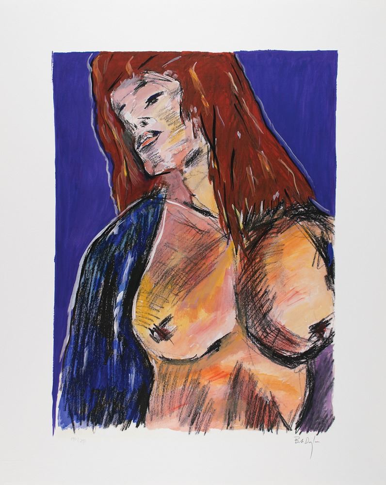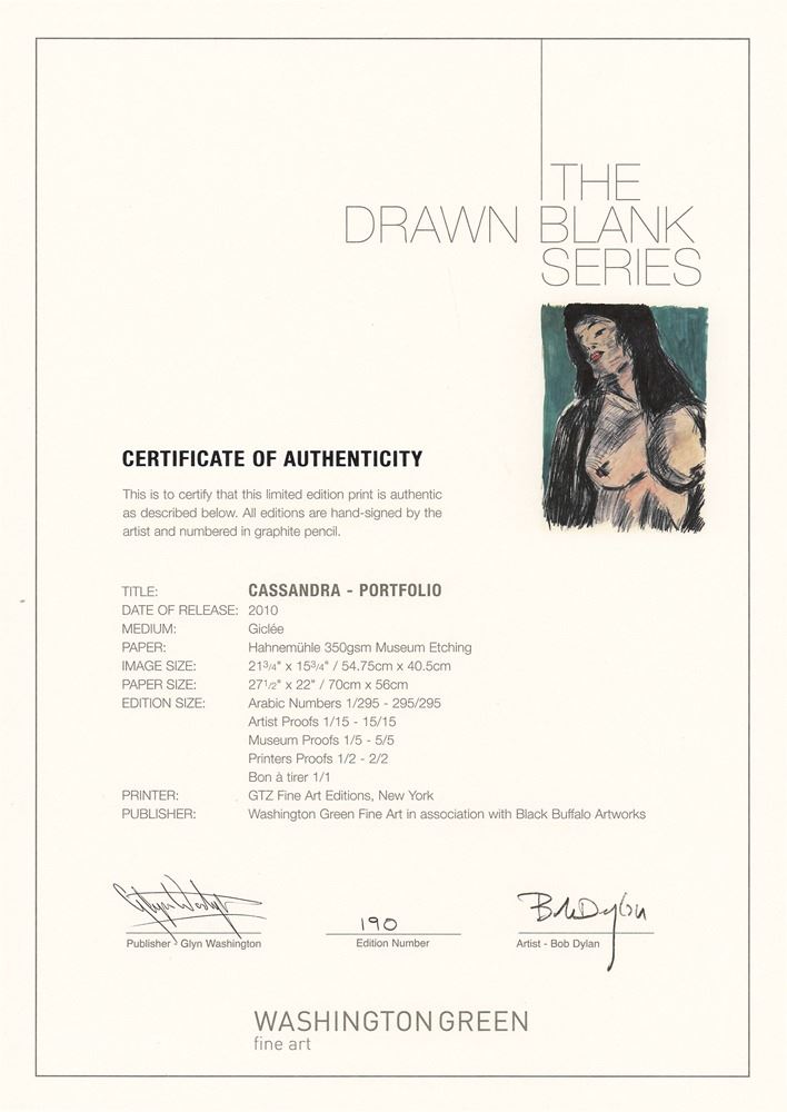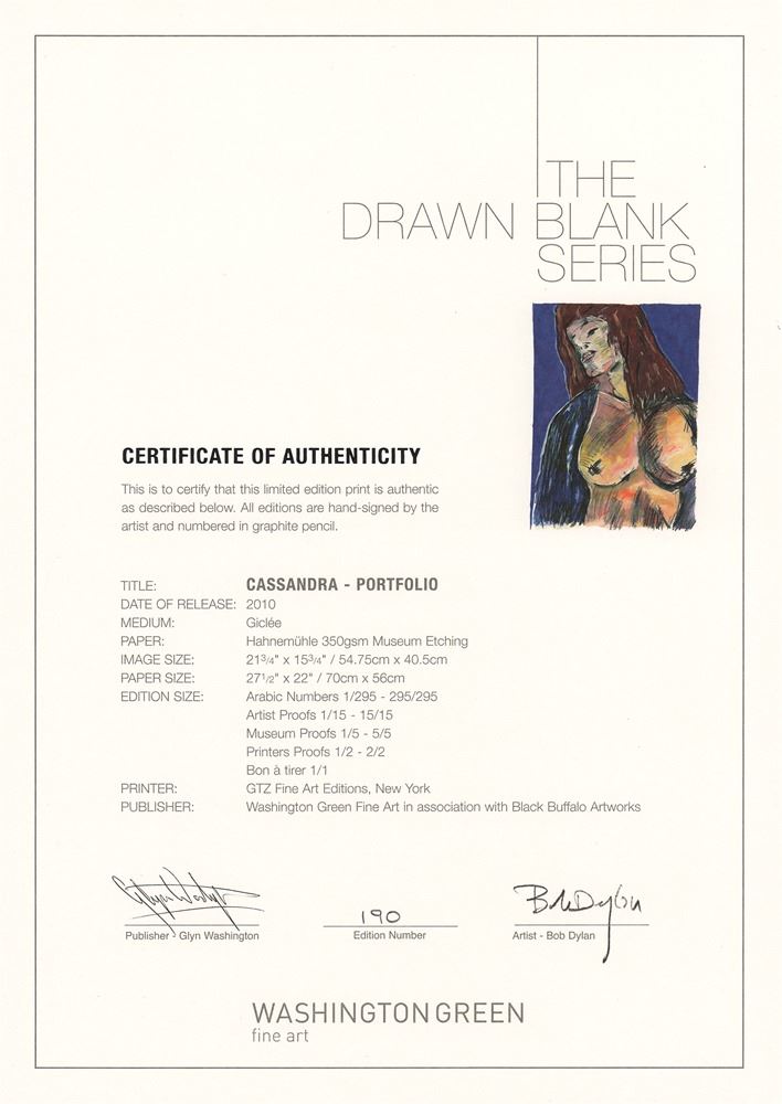 Desirable portfolio suite of four limited edition giclee prints from the 2010 release of Bob Dylan's 'Drawn Blank' series, all numbered 190/295, 22 x 27.5, each signed in the lower border in pencil by Dylan. Portraying the topless 'Cassandra' cloaked in different colors, these vivid, sensuous prints are stunning examples of Dylan's artwork. In overall very fine condition. Housed together in their original 'Drawn Blank' portfolio folder, each print is accompanied by its corresponding certificate of authenticity from Washington Green Fine Art.