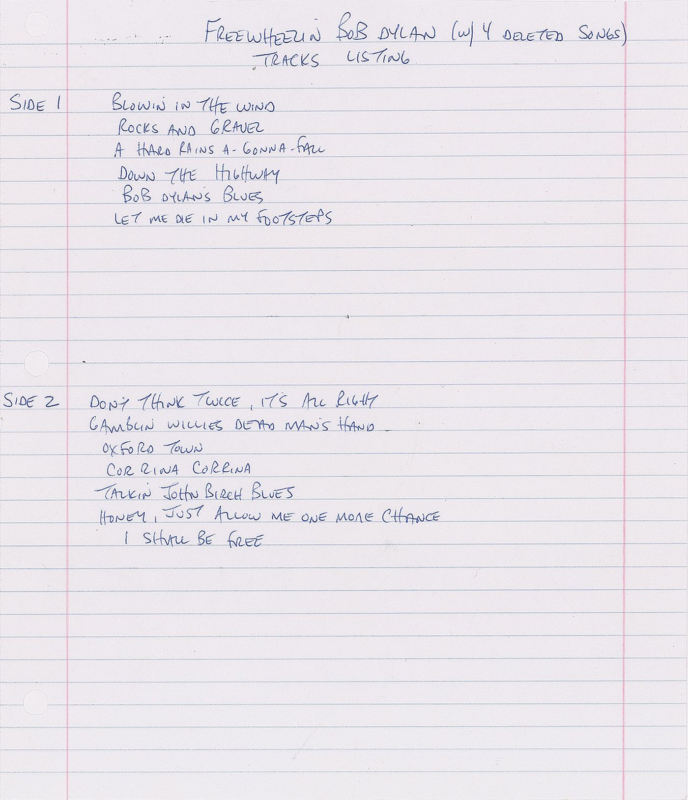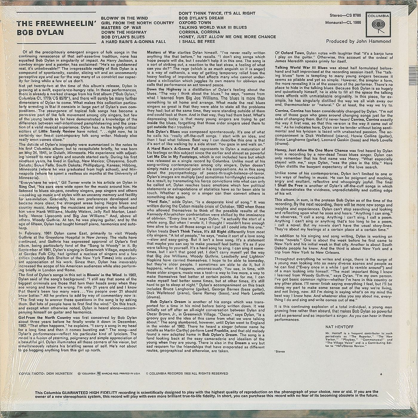 Just before the release of The Freewheelin' Bob Dylan in May 1963, the decision was made to replace four of its tracks. The reasoning behind the change is not entirely known. Some speculate that because CBS television's censors refused to allow him to perform 'Talkin' John Birch Paranoid Blues' on the Ed Sullivan Show—in a controversial episode that afforded Dylan increased publicity—the CBS-owned Columbia Records then demanded that the song be pulled from the album. Others note that the four 'replacement' tracks were recorded after the album was completed, and may have simply been too good to be left off—they include the Dylan classics 'Masters of War' and 'Girl From The North Country.' In any case, replacement masters featuring the new songs were made, the cover art was changed, and the disc's labels revised. However, a small number of copies were accidentally pressed using the original stampers—these, with matrix numbers ending in "-1A," play the controversial 'Talkin’ John Birch Paranoid Blues' along with the three other withdrawn tracks. According to Jeff Gold of Recordmecca, fewer than 20 of these original mono pressings of Freewheelin' have surfaced since the album's release.