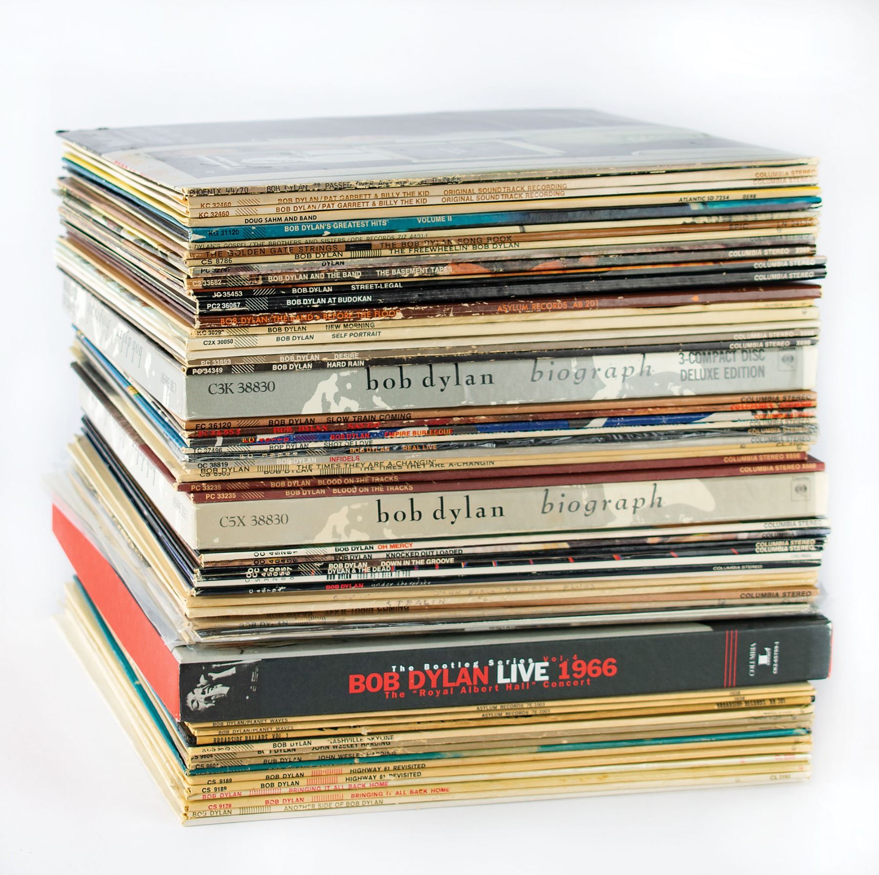Tony Glover’s collection of 60 albums from, featuring, or inspired by Bob Dylan, with the titles as follows (includes several rare promos and bootlegs): Another Side of Bob Dylan; The Basement Tapes; Before the Flood (promo); Biograph (2: 3-CD deluxe edition promo and 5-record deluxe edition); Blonde on Blonde (2); Blood on the Tracks (2); Bob Dylan debut (2, with one first pressing); Bob Dylan at Budokan (promo); Bob Dylan’s Greatest Hits; Bob Dylan’s Greatest Hits, Vol. II; The Bob Dylan Song Book by The Golden Gate Strings; The Bootleg Series Vol. 4: Bob Dylan Live 1966, The ‘Royal Albert Hall’ Concert; Bringing It All Back Home (2); Broadside Ballads, Vol. 1; Desire; Doug Sahm and Band; Down in the Groove; Dylan; Dylan & the Dead; The Dylan London Interview, July 1981 (promo); Dylan's Gospel by The Brothers & Sisters of L.A. (promo); Empire Burlesque; The Freewheelin' Bob Dylan; Good as I Been to You; G. W. W., ‘John Birch Society Blues’ (bootleg); Hard Rain (promo); Highway 61 Revisited (2, with one promo); Infidels; Isle Of Wight (bootleg); John Wesley Harding (2, with one promo); Knocked Out Loaded; Nashville Skyline (promo); New Morning; Oh Mercy; Passed Over And Rolling Thunder (bootleg); Pat Garrett & Billy the Kid (2, with one promo); Planet Waves (2); Real Live; Renaldo and Clara (2: 4-song promos); The Royal Albert Hall Concert 1966 (bootleg); Saved (promo); Self Portrait; Shot of Love (promo); Slow Train Coming (2); Stealin’ (bootleg); Street-Legal; The Times They Are a-Changin' (2); and Under the Red Sky. In overall fine condition, with scattered creases, and a clipped upper corner to Basement Tapes. All of the records are included.