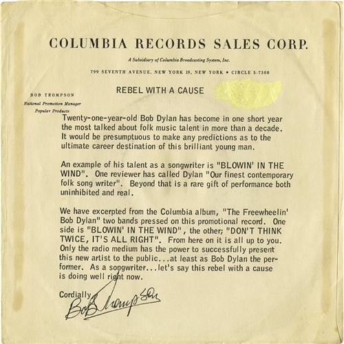 <B>Bob Dylan "Blowin' In The Wind" Rare Promo "Rebel With A Cause" Sleeve Columbia 75606 (1963).</B></I> One of the two rarest Dylan picture sleeves is this artifact from 1963. It was a promotional-issue only, and didn't feature a picture at all, just some promo words from Columbia's National Promotion Manager, Bob Thompson. The back was blank. To promote the album <I>The Freewheelin' Bob Dylan,</B></I> the sleeve enclosed a disc of "Blowin' In The Wind" and "Don't Think Twice". Oh, and if you want to know what the <I>other</B></I> rare Dylan picture sleeve is, just go to the next lot! There is some whiteout on the front of this copy. Condition: EX 7.