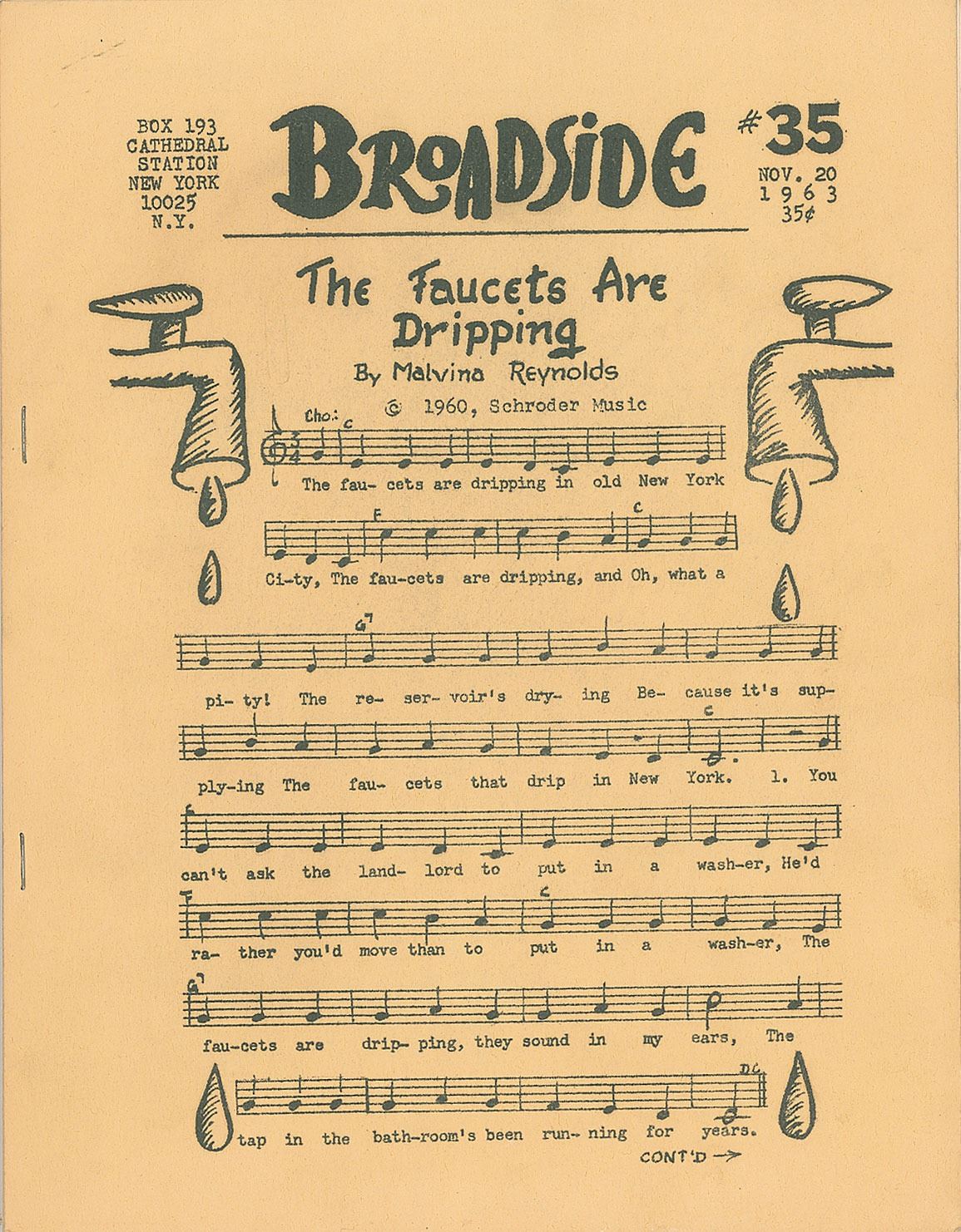 Tony Glover's original vintage Broadside sheet music booklet, issue No. 35, eight pages, 8.5 x 11, dated November 20, 1963, with front cover featuring lyrics and music for 'The Faucets Are Dripping' by Malvina Reynolds. Most notably the booklet contains lyrics for a song by Bob Dylan entitled ‘—for Dave Glover,’ which reads, in part: “Dave Glover—harmonica sidekick an guitar pardner / Dave Glover—best friend in the highest form / Dave Glover—true rebel an unconscious outlaw / Dave Glover—ramblin do-gooder a the best breed / Dave Glover—who knew me before I hit or got hit by New York City / Dave Glover—who's everythin I stand for or am a part of.” The booklet also contains lyrics and music by Tom Paxton, Gene Kadish, Dayle Stanley, Phil Ochs, and Bill Frederick. In fine condition. Originally written as a letter from Dylan to his friend Tony Glover, the poem '—for Dave Glover’ was instead included as a poem in the original program for the 1963 Newport Folk Festival.