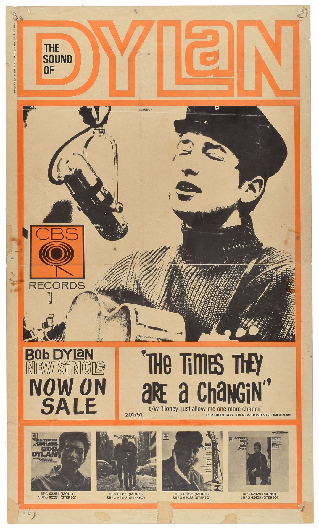 Rare UK CBS Records promotional poster for Bob Dylan’s 1964 single ‘The Times They Are a-Changin’ / Honey, Just Allow Me One More Chance,’ 12.5 x 21.25, with a large image of Dylan behind a microphone and bold upper text reading: “The Sound of Dylan.” The lower border shows images of four of Dylan’s album covers. In folded, very good condition, with tack holes to the margins, some tape stains and associated surface loss, and a short split along one of the intersecting folds. Accompanied by a certificate of authenticity from Tracks.