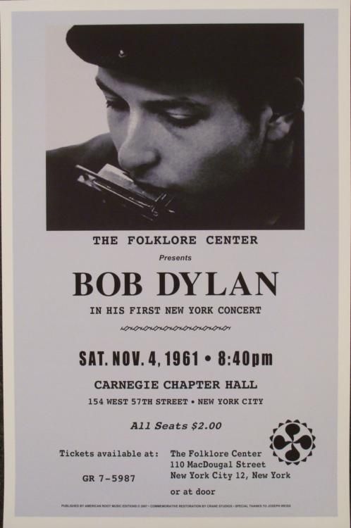 Bob Dylan, Carnegie Hall, 1961 Repro Concert Poster