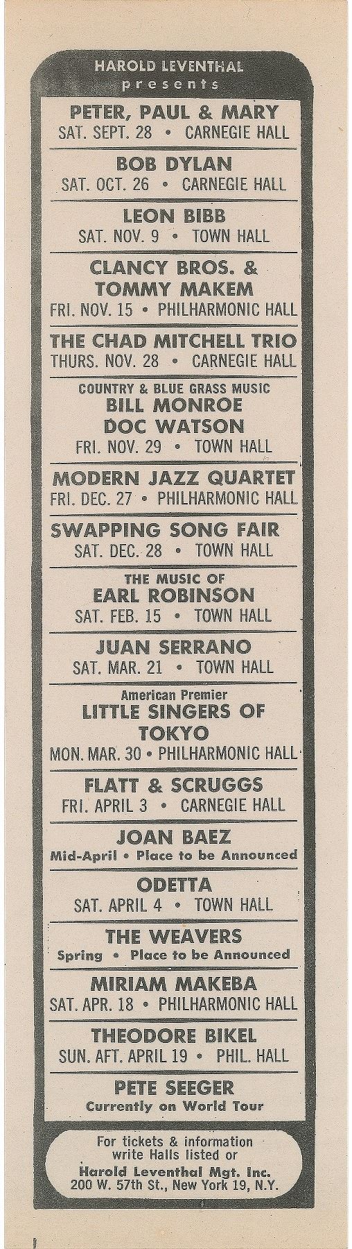 Tremendously rare circa 1963 vintage handbill from Harold Leventhal Management of New York, 3 x 11, promoting a total of 18 musical acts and their upcoming concerts in late 1963–early 1964. Listed second from the top is Dylan's now legendary concert at Carnegie Hall on Saturday, October 26, 1963. Other acts include: Peter, Paul & Mary, Leon Bibb, Clancy Bros. & Tommy Makem, The Chad Mitchell Trio, Bill Monroe and Doc Watson, Modern Jazz Quartet, Swapping Song Fair, Earl Robinson, Juan Serrano, Little Singers of Tokyo, Flatt & Scruggs, Joan Baez, Odetta, The Weavers, Miriam Makeba, Theodore Bikel, and Pete Seeger. In fine condition. Recorded by CBS Records for a proposed live LP tentatively entitled In Concert, Dylan’s 19-song performance at Carnegie Hall on October 26, 1963, was all but forgotten following the assassination of President Kennedy. In 1991, four songs emerged on The Bootleg Series, Vols. 1-3, and then another six on the 2005 release of Live at Carnegie Hall 1963; the remaining nine songs were released in 2013 on the European limited vinyl release The 50th Anniversary Collection 1963. A remarkable piece of music history relating to Dylan's fabled stop at Carnegie Hall.