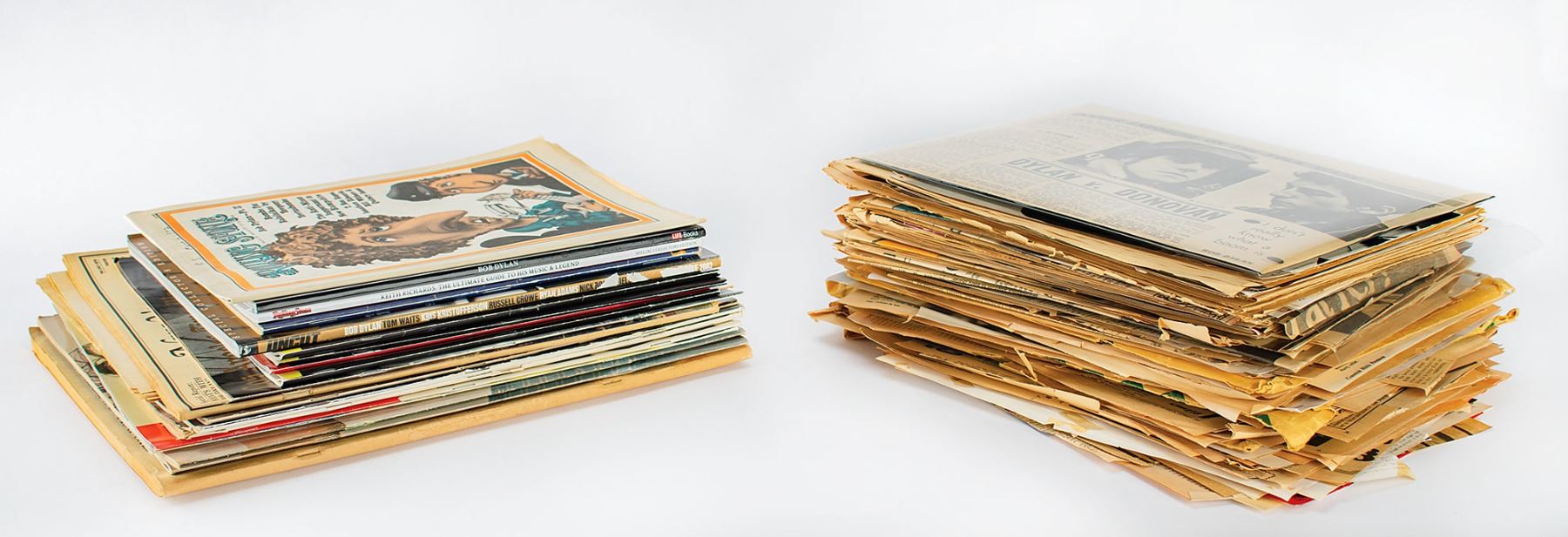 Tony Glover's archive of press clippings about Bob Dylan, ranging from the 1960s to the present day. Includes original newspaper clippings, pages from magazines, program pages, some photocopies, and complete issues of modern magazines. Includes one "Dylan vs. Donovan" clipping in it original exhibition mount from the "Bob Dylan's American Journey, 1956–1966" exhibit held at the Experience Music Project in Seattle in 2004–2005, annotated in pencil with exhibit inventory data on the reverse. The archive fills one-and-a-half Bankers boxes. In overall very good to fine condition.