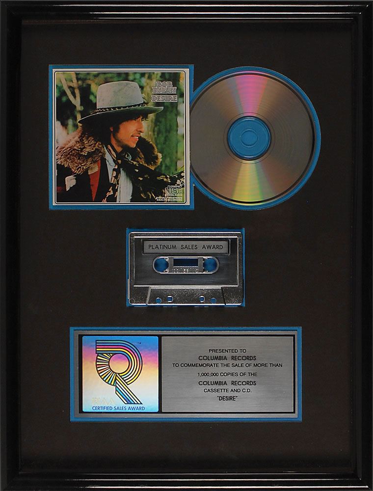 Official RIAA hologram platinum sales award presented to Columbia Records to commemorate the sale of more than 1,000,000 copies “of the Columbia Records cassette and C. D. ‘Desire.’” Matted and framed with a copy of the cassette and CD, and an image of the cover, to an overall size of 12.75 x 17. In fine condition.