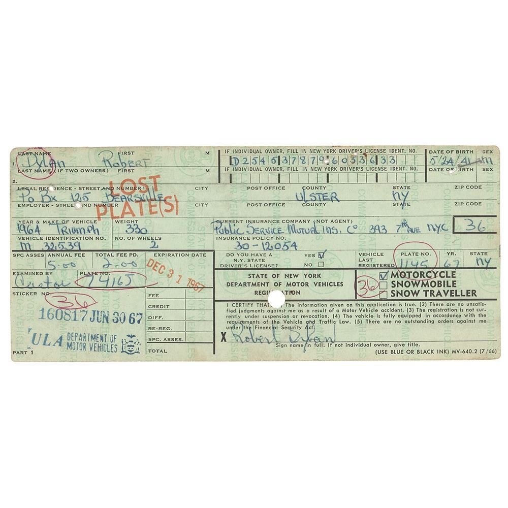 DS, signed “Robert Dylan,” one page, 7.25 x 3.25, June 30, 1967. A State of New York Department of Motor Vehicles registration for Bob Dylan's 1964 Triumph motorcycle, with the left side stamped in orange: "Lost Plate(s)." The sheet has been filled out in another hand and contains the following fields: Last and first names: "Dylan, Robert"; Legal residence: "PO Bx 125 Bearsville, Ulster, NY"; Date of birth: "5/24/41"; Vehicle year, make, and weight: "1964, Triumph, 330"; Insurance company: "Public Service Mutual"; and Vehicle last registered: "Plate No. 1145, Yr. 67, State NY." The box to lower left lists the updated plate number as "74165" with sticker number "36" and an expiration date of December 31, 1967. Signed at the conclusion in ballpoint by Dylan. In fine condition.