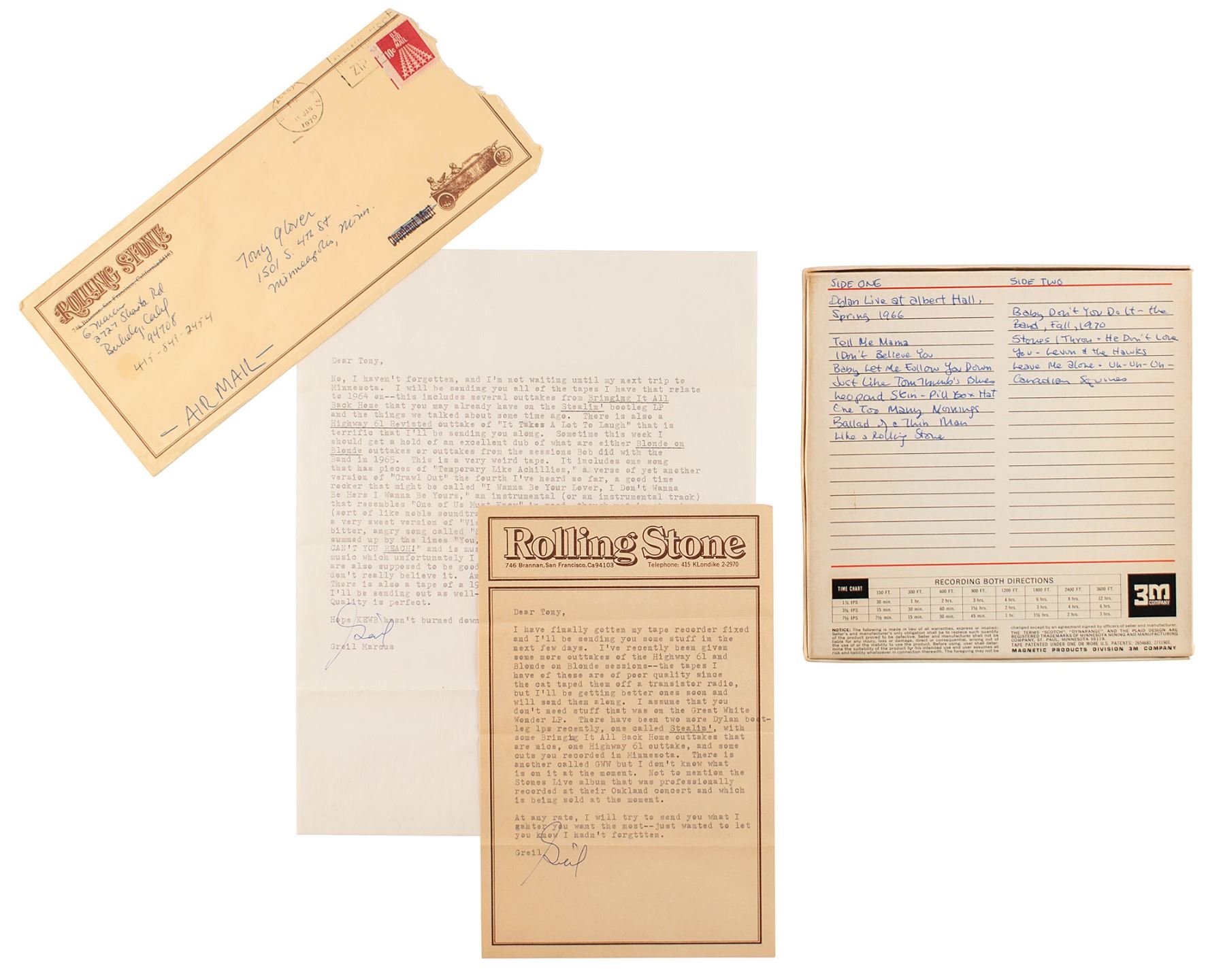 Two typed letters signed by Rolling Stone critic Greil Marcus to Tony Glover about Dylan bootlegs, plus a 1/4-inch reel-to-reel tape marked "Dylan & Band - Albert Hall 1966 / Band Singles," with track listing on the reverse. One letter, in part: "I've finally gotten my tape recorder fixed and I'll be sending you some stuff in the next few days. I've recently been given some more outtakes of the Highway 61 and Blonde on Blonde sessions—the tapes I have of these are of poor quality since the cat taped them off a transistor ratio…There have been two more Dylan bootleg lps recently, one called Stealin', with some Bringing It All Back Home outtakes that are nice, one Highway 61 outtake, and some cuts you recorded in Minnesota." The other, in part: "I will be sending you all of the tapes I have that relate to 1964 on—this includes several outtakes from Bringing It All Back Home that you may already have…There is also a Highway 61 Revisited outtake of 'It Takes a Lot to Laugh' that is terrific that I'll be sending you along. Sometime this week I should get a hold of an excellent dub of what are either Blonde on Blonde outtakes or outtakes from the sessions Bob did with the Band in 1965. This is a very weird tape." Also includes the private pressing two-CD set compiled by Greil Marcus entitled "Like a Rolling Stone: Bob Dylan at the Crossroads," produced in 2005. In overall fine condition. Notably, Glover would go on to write the liner notes for The Bootleg Series Vol. 4: Bob Dylan Live 1966, The "Royal Albert Hall" Concert, released in 1998.