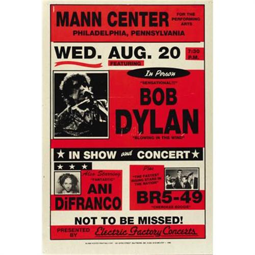 <B>Bob Dylan Mann Center Concert Poster (1996).</B></I> Bob Dylan is showcased in this poster for a "not to be missed" event, co-starring Country Rockers BR-549 and Feminist Folkie Ani DiFranco. This red and black showcard measures approximately 22.5" x 33", and is in VG+ condition.<BR><BR><b>Shipping:</b> Flat Material, Large (<a target="_blank" href="http://www.heritageauctions.com/common/shipping.php">view shipping information</a>)