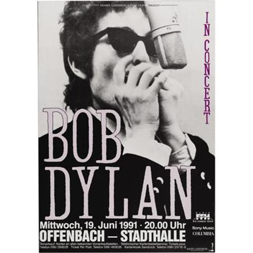 <B>Bob Dylan Offenbach Germany Concert Poster (1991).</B></I> This oversized poster is not particularly old, but it does feature a cool mid-'60s photo of our favorite raspy-voiced singer-songwriter. It's from Bob's 1991 European Summer tour, which included stops in Italy, Yugoslavia, and Hungary before hitting Germany in June of that year. The poster measures approximately 23.5" x 33.25" and is in NM- condition.<BR><BR><b>Shipping:</b> Flat Material, Large (<a target="_blank" href="http://www.heritageauctions.com/common/shipping.php">view shipping information</a>)